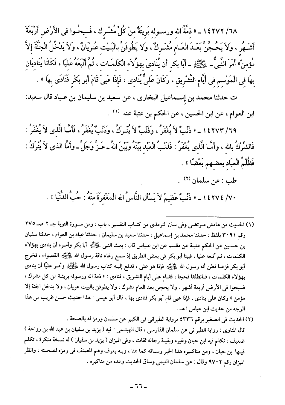 68/ 14272 - "ذِمَّةُ اللَّهِ ورسولهِ بَرِيئَةٌ مِنْ كُلِّ مُشْركٍ، فسِيحُوا في الأَرْضِ أَرْبَعَةَ أَشْهُرٍ، وَلَا يَحُجَّنَّ بَعْدَ العَامِ مُشرِكٌ، وَلا يَطُوفَنَّ بالبَيْتِ عُرْيَانٌ، وَلَا يَدْخُلُ الجَنَّةَ إِلَّا مُؤمِنٌ" أَمَرَ النَّبىُّ -صلى اللَّه عليه وسلم- أَبَا بكرٍ أَن يُنَادِى بِهؤُلَاءِ الكَلِمَاتِ، ثُمَّ أتْبَعَهُ عَلِيًا, فَكَانَا يُنَادِيَانِ بِهَا فِى الْمَوْسِم فِى أَيَّامِ التَّشْرِيقِ، وَكَانَ عَلِىٌّ يُنَادِى، فَإِذَا عَيى قَامَ أَبو بَكرٍ فَنادَى بِهَا".