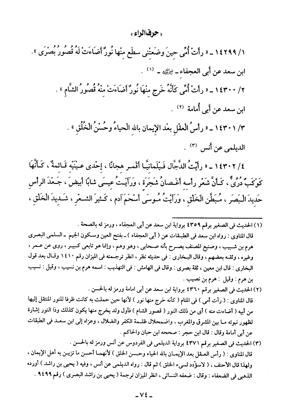 4/ 14302 - "رأَيْتُ الدَّجَّال فَيْلَمانِيَّا أَقْمر هِجانًا، إِحْدى عيْنَيْهِ قَائِمةٌ، كَأنَّهَا كَوْكَبٌ دُرِّىٌّ، كَأَنَّ شَعْر رأسِهِ أغْصانُ شَجَرَةٍ، وَرَأَيْتُ عِيسَى شابًا أبيضَ، جَعْدَ الرأسِ حَدِيدَ الْبَصَر، مُبَطَّن الخَلقِ، وَرَأَيْتُ مُوسَى أَسْحَمَ آدم، كَثيرَ الشَّعْرِ، شَدِيدَ الْخَلقِ،