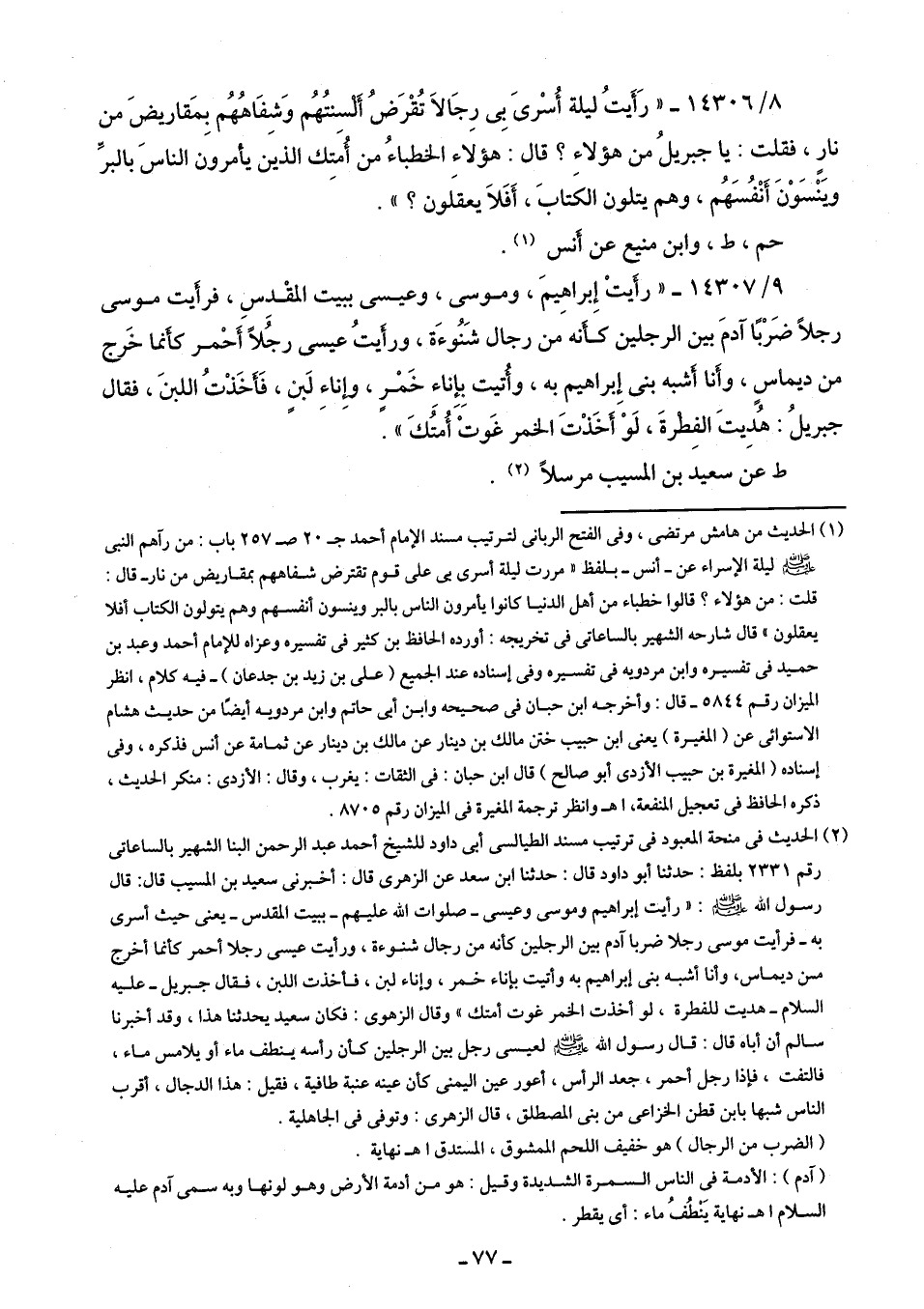 (¬1) الحديث من هامش مرتضى، وفى الفتح الربانى لترتب مسند الإمام أحمد جـ 20 ص 257 باب: من رآهم النبى -صلى اللَّه عليه وسلم- ليلة الإسراء عن -أنس- بلفظ "مررت ليلة أسرى بى على قوم تقترض شفاههم بمقاريض من نار - قال: قلت: من هؤلاء؟ قالوا خطباء من أهل الدنيا كانوا يأمرون الناس بالبر وينسون أنفسهم وهم يتولون الكتاب أفلا يعقلون" قال شارحه الشهير بالساعاتى في تخريجه: أورده الحافظ بن كثير في تفسيره وعزاه للإمام أحمد وعبد بن حميد في تفسيره وابن مردويه في تفسيره وفى إسناده عند الجميع (على بن زيد بن جدعان) -فيه كلام، انظر الميزان رقم 5844 - قال: وأخرجه ابن حبان في صحيحه وابن أَبى حاتم وابن مردويه أيضًا من حديث هشام الاستوائى عن (المغيرة) يعنى ابن حبيب ختن مالك بن دينار عن مالك بن دينار عن ثمامة عن أنس فذكره، وفى إسناده (المغيرة بن حبيب الأزدى أبو صالح) قال ابن حبان: في الثقات: يغرب، وقال: الأزدى: منكر الحديث، ذكره الحافظ في تعجيل المنفعة، اهـ وانظر ترجمة المغيرة في الميزان رقم 8705.