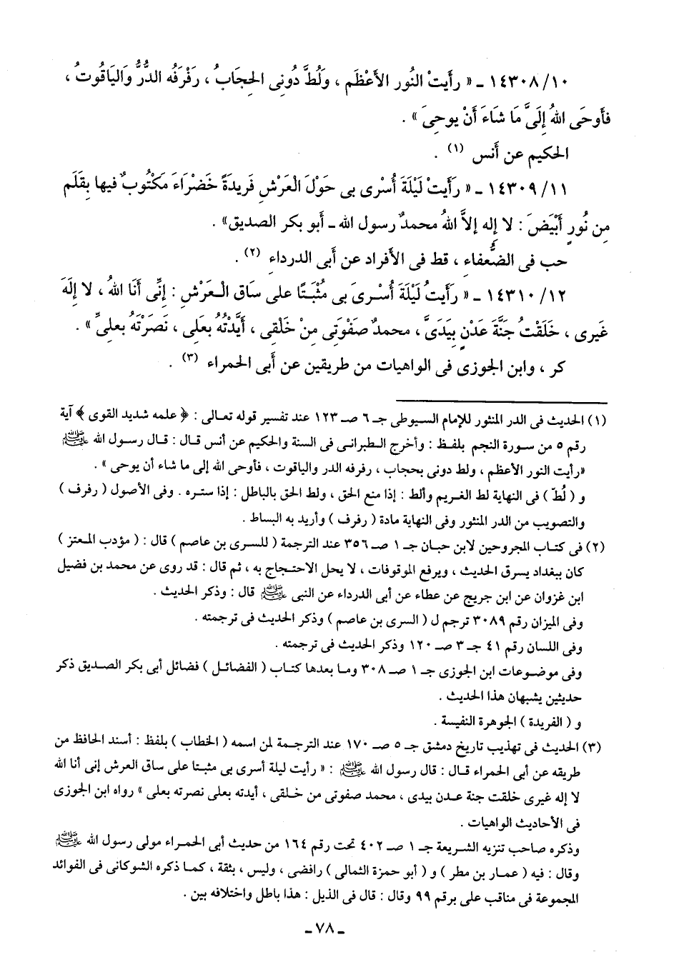 11/ 14309 - "رَأَيتْ لَيْلَةَ أُسْرى بى حَوْلَ الْعَرْشِ فَريدَةً خَضْرَاءَ مَكْتُوبٌ فيها بِقَلَم مِن نُورٍ أبيَضَ: لا إِله إلَّا اللَّهُ محمدٌ رسول اللَّه - أَبو بكر الصديق".