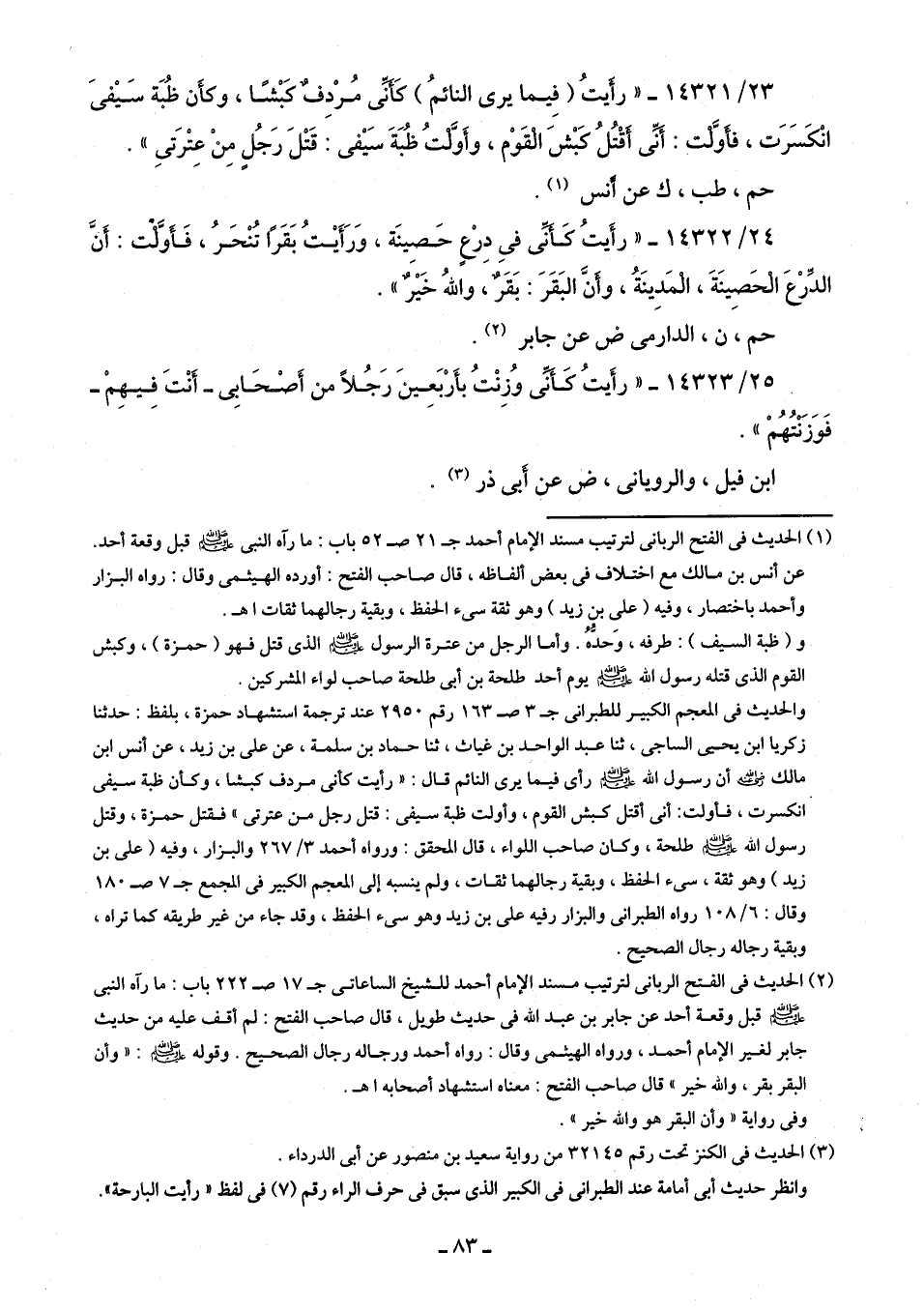 24/ 14322 - "رأَيتُ كَأَنِّى فِى دِرعٍ حَصِينَة، وَرَأَيْتُ بَقَرًا تُنْحَرُ، فَأَوَّلْت: أَنَّ الدِّرْعَ الْحَصِينَةَ، الْمَدِينَةُ، وأنَّ البَقَرَ: بَقَرٌ، واللَّهُ خَيْرٌ".