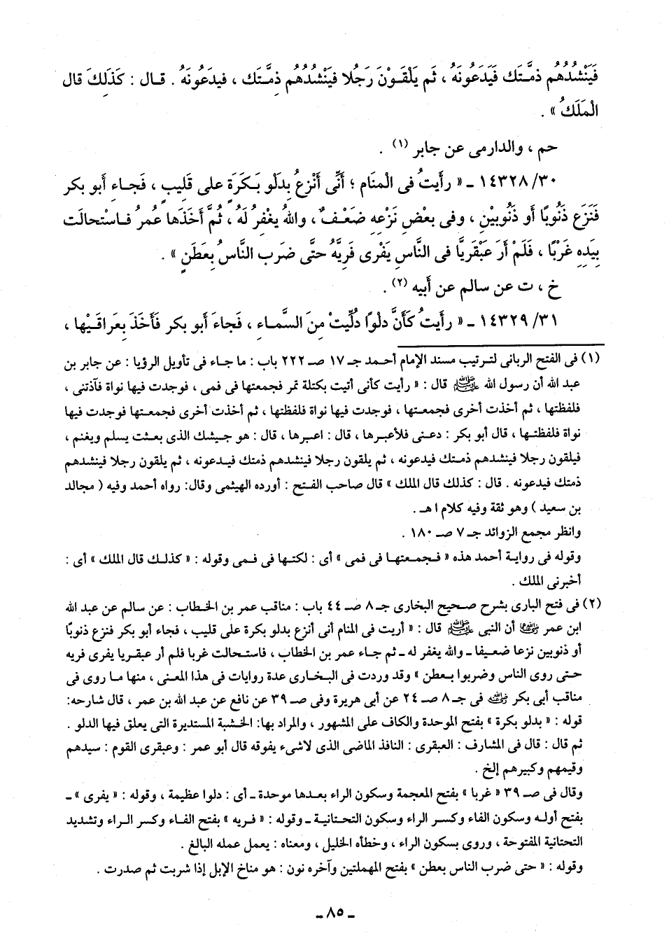(¬1) في الفتح الربانى لترتيب مسند الإمام أحمد جـ 17 ص 222 باب: ما جاء في تأويل الرؤيا: عن جابر بن عبد اللَّه أن رسول اللَّه -صلى اللَّه عليه وسلم- قال: "رأيت كأنِّى أتيت بكتلة تمر فجمعتها في فمى، فوجدت فيها نواة فآذتنى، فلفظتها، ثم أخذت أخرى فجمعتها، فوجدت فيها نواة فلفظتها، ثم أخذت أخرى فجمعتها فوجدت فيها نواة فلفظتها، قال أبو بكر: دعنى فلأعبرها، قال: اعبرها، قال: هو جيشك الذى بعثت يسلم ويغنم، فيلقون رجلا فينشدهم ذمتك فيدعونه، ثم يلقون رجلا فينشدهم ذمتك فيدعونه، ثم يلقون رجلا فينشدهم ذمتك فيدعونه. قال: كذلك قال الملك" قال صاحب الفتح: أورده الهيثمى وقال: رواه أحمد وفيه (مجالد بن سعيد) وهو ثقة وفيه كلام اهـ.