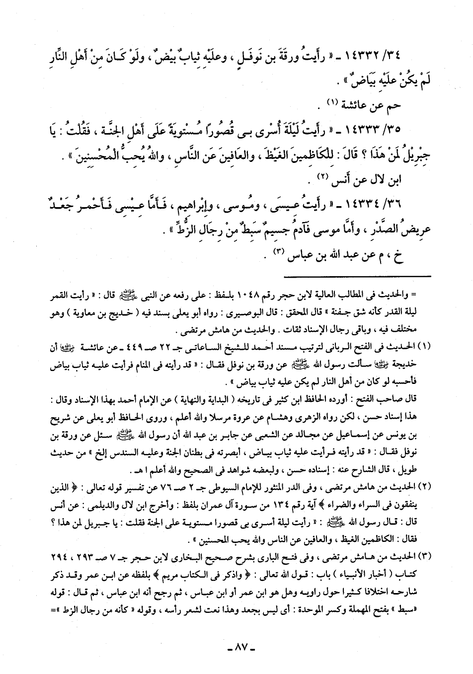 34/ 14332 - "رأَيتُ ورقَةَ بن نَوفَلٍ، وعلَيْهِ ثِيابٌ بيْضٌ، ولَوْ كَانَ مِنْ أَهْلِ النَّارِ لَمْ يكُنْ علَيْهِ بَيَاضٌ".