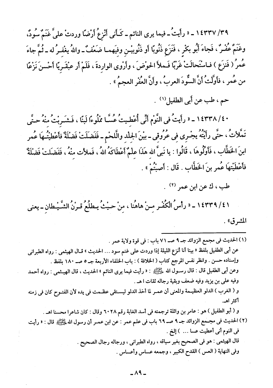 (¬2) الحديث في مجمع الزوائد جـ 9 ص 69 باب في علم عمر: عن ابن عمر أن رسول اللَّه -صلى اللَّه عليه وسلم- قال: "رأيت في النوم أنى أعطيت عسا. . .) إلخ.