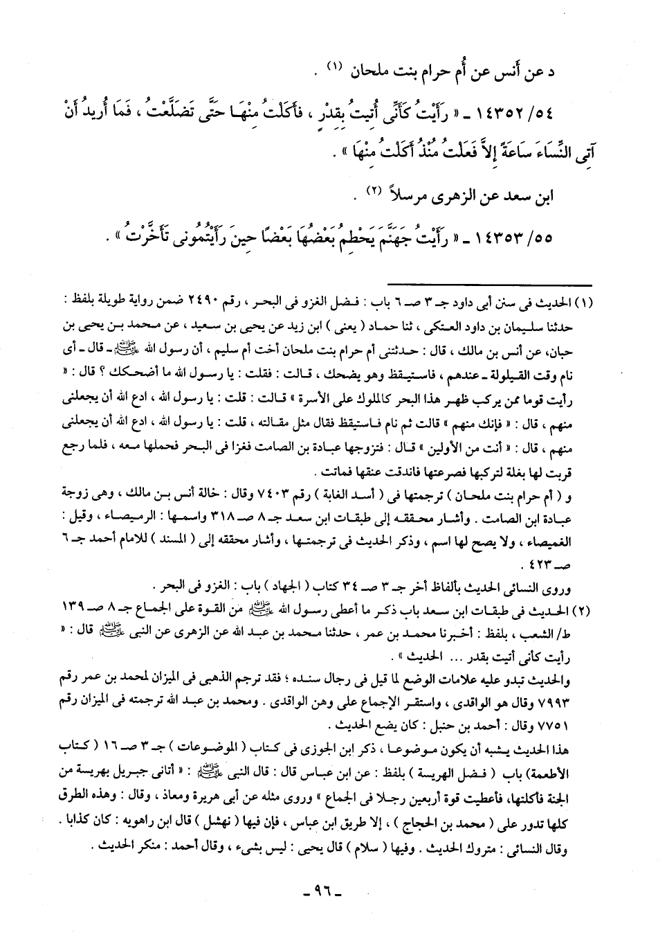 (¬1) الحديث في سنن أَبى داود جـ 3 ص 6 باب: فضل الغزو في البحر، رقم 2490 ضمن رواية طويلة بلفظ: حدثنا سليمان بن داود العتكى، ثنا حماد (يعنى) ابن زيد عن يحيى بن سعيد، عن محمد بن يحيى بن حبان، عن أنس بن مالك، قال: حدثتنى أم حرام بنت ملحان أخت أم سليم، أن رسول اللَّه -صلى اللَّه عليه وسلم- قال -أى نام وقت القيلولة- عندهم، فاستيقظ وهو يضحك، قالت: فقلت: يا رسول اللَّه ما أضحكك؟ قال: "رأيت قوما ممن يركب ظهر هذا البحر كالملوك على الأسرة" قالت: قلت: يا رسول اللَّه، ادع اللَّه أن يجعلنى منهم، قال: "فإنك منهم" قالت ثم نام فاستيقظ فقال مثل مقالته، قلت: يا رسول اللَّه، ادع اللَّه أن يجعلنى منهم، قال: "أنت من الأولين" قال: فتزوجها عبادة بن الصامت فغزا في البحر فحملها معه، فلما رجع قربت لها بغلة لتركبها فصرعتها فاندقت عنقها فماتت.