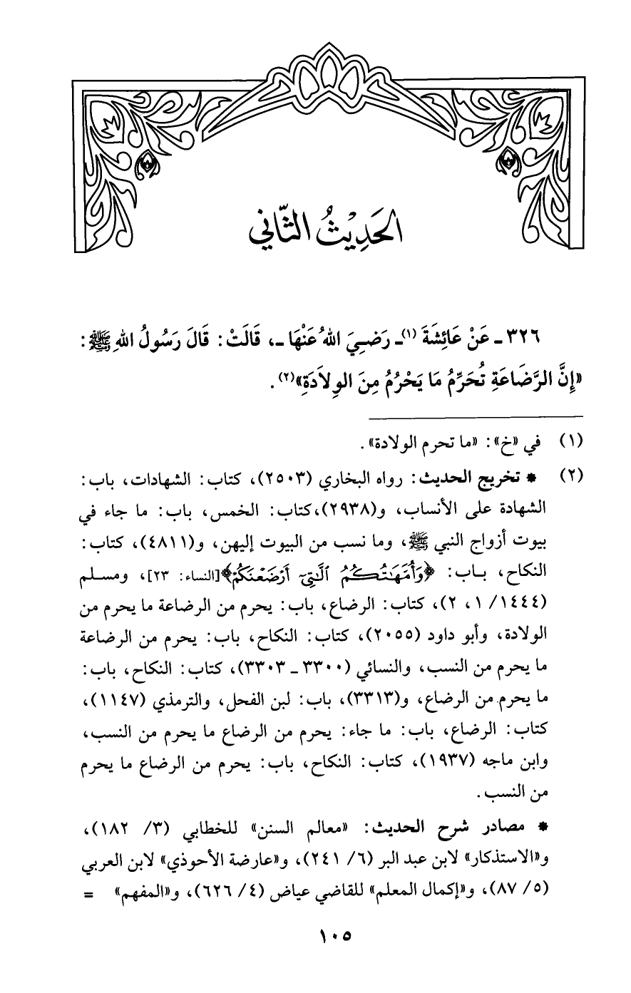 326 - عَنْ عَائِشَةَ (¬1) -رَضِيَ اللَّهُ عَنْهَا-، قَالَتْ: قَالَ رَسُولُ اللَّهِ -صلى اللَّه عليه وسلم-: "إِنَّ الرَّضَاعَةِ تُحَرِّمُ مَا يَحْرُمُ مِنَ الوِلَادَةِ" (¬2).