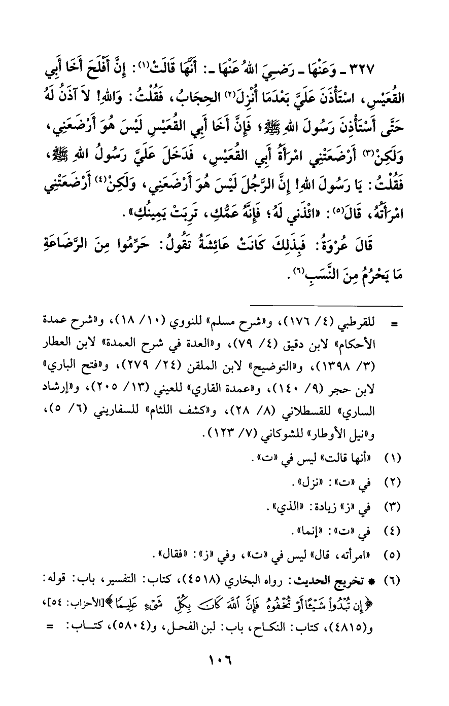 327 - وَعَنْهَا -رضي اللَّه عنها-: أَنَّهَا قَالَتْ (¬1): إِنَّ أفلَحَ أَخَا أَبِي القُعَيْسِ، اسْتَأْذَنَ عَلَيَّ بَعْدَمَا أُنْزِلَ (¬2) الحِجَابُ، فَقُلْتُ: وَاللَّهِ! لَا آذَنُ لَهُ حَتَّى أَسْتَاْذِنَ رَسُولَ اللَّهِ -صلى اللَّه عليه وسلم-؛ فَإِنَّ أَخَا أَبِي القُعَيْسِ لَيْسَ هُوَ أَرْضَعَنِي، وَلَكِنْ (¬3) أَرْضَعَتْنِي امْرَأَةُ أَبِي القُعَيْسِ، فَدَخَلَ عَلَيَّ رَسُولُ اللَّهِ -صلى اللَّه عليه وسلم-، فَقُلْتُ: يَا رَسُولَ اللَّهِ! إِنَّ الرَّجُلَ لَيْسَ هُوَ أَرْضَعَنِي، وَلَكِنْ (¬4) أَرْضَعَتْنِي امْرَأتُهُ، قَالَ (¬5): "ائْذَني لَهُ؛ فَإِنَّهُ عَمُّكِ، تَرِبَتْ يَمِينُكِ".