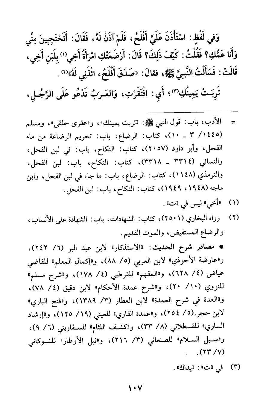 = الأدب، باب: قول النبي -صلى اللَّه عليه وسلم-: "تربت يمينك"، و"عقرى حلقى"، ومسلم (1445/ 3 - 10)، كتاب: الرضاع، باب: تحريم الرضاعة من ماء الفحل، وأبو داود (2057)، كتاب: النكاح، باب: في لبن الفحل، والنسائي (3314 - 3318)، كتاب: النكاح، باب: لبن الفحل، والترمذي (1148)، كتاب: الرضاع، باب: ما جاء في لبن الفحل، وابن ماجه (1948، 1949)، كتاب: النكاح، باب: لبن الفحل.