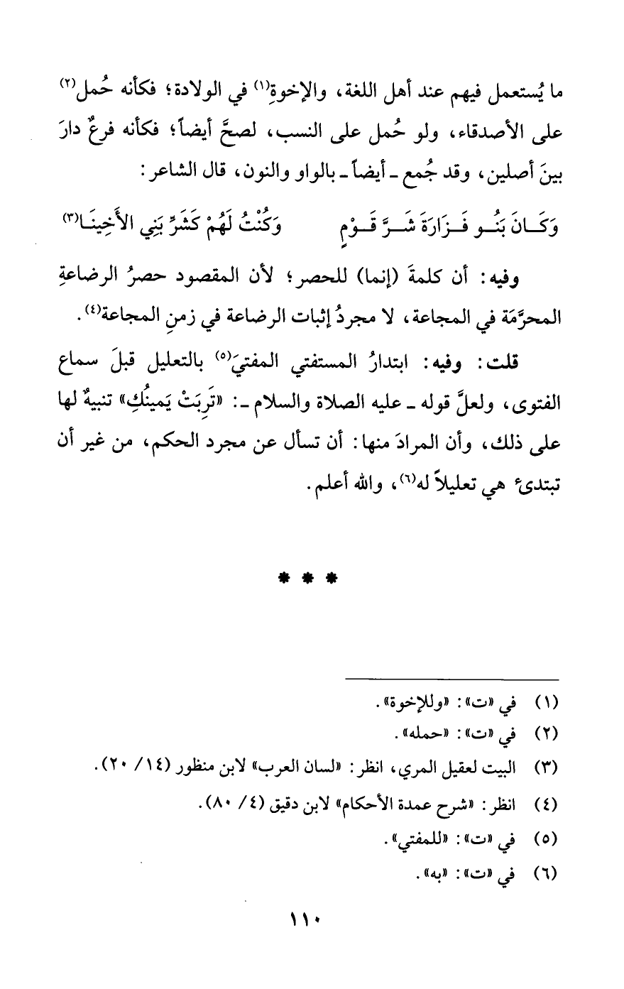 ما يُستعمل فيهم عند أهل اللغة، والإخوةِ (¬1) في الولادة؛ فكأنه حُمل (¬2) على الأصدقاء، ولو حُمل على النسب، لصحَّ أيضًا؛ فكأنه فرعٌ دارَ بينَ أصلين، وقد جُمع -أيضًا- بالواو والنون، قال الشاعر: