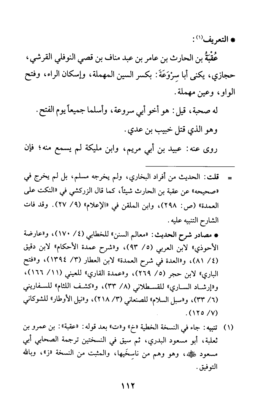 (¬1) تنبيه: جاء في النسخة الخطية "خ" و"ت" بعد قوله: "عقبة": بن عمرو بن ثعلبة، أبو مسعود البدري، ثم سيق في النسختين ترجمة الصحابي أبي مسعود -رضي اللَّه عنه-، وهو وهم من ناسِخَيها، والمثبت من النسخة "ز"، وباللَّه التوفيق.