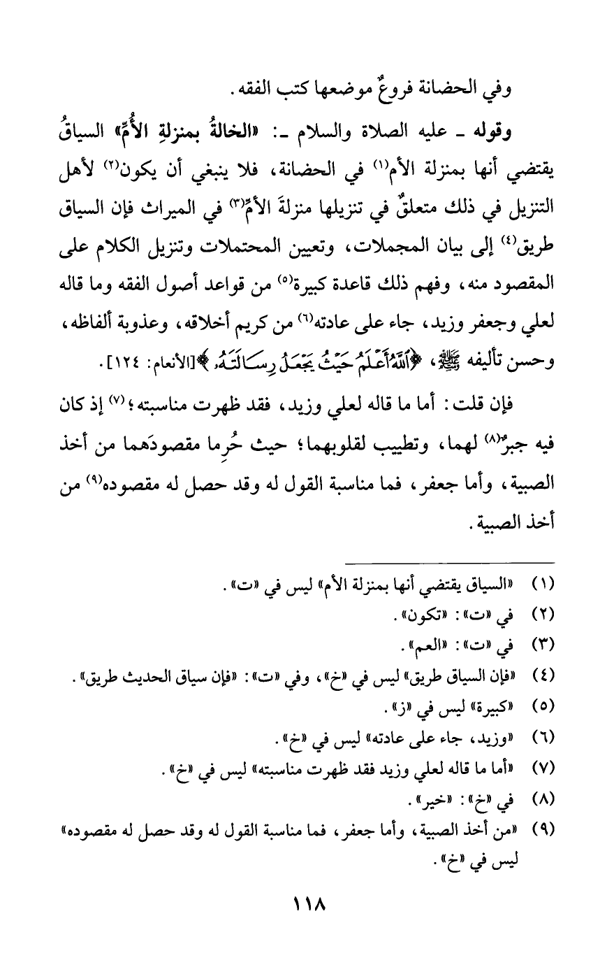 وقوله -عليه الصلاة والسلام-: "الخالةُ بمنزلةِ الأُمِّ" السياقُ يقتضي أنها بمنزلة الأم (¬1) في الحضانة، فلا ينبغي أن يكون (¬2) لأهل التنزيل في ذلك متعلقٌ في تنزيلها منزلةَ الأمِّ (¬3) في الميراث فإن السياق طريق (¬4) إلى بيان المجملات، وتعيين المحتملات وتنزيل الكلام على المقصود منه، وفهم ذلك قاعدة كبيرة (¬5) من قواعد أصول الفقه وما قاله لعلي وجعفر وزيد، جاء على عادته (¬6) من كريم أخلاقه، وعذوبة ألفاظه، وحسن تأليفه -صلى اللَّه عليه وسلم-، {اللَّهُ أَعْلَمُ حَيْثُ يَجْعَلُ رِسَالَتَهُ} [الأنعام: 124].
