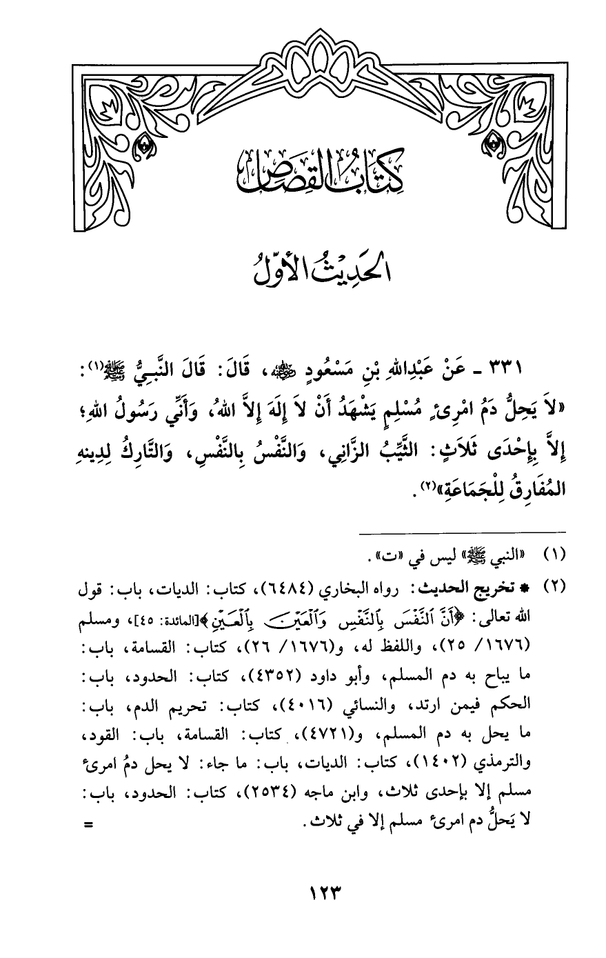 331 - عَنْ عَبْدِ اللَّهِ بْنِ مَسْعُودٍ -رضي اللَّه عنه-، قَالَ: قَالَ النَّبِيُّ -صلى اللَّه عليه وسلم- (¬1): "لَا يَحِلُّ دَمُ امْرِىءٍ مُسْلِمٍ يَشْهَدُ أَنْ لَا إِلَهَ إِلَّا اللَّهُ، وَأَنِّي رَسُولُ اللَّهِ؛ إِلَّا بِإحدَى ثَلَاثٍ: الثَّيِّبُ الزَّانِي، وَالنَّفْسُ بِالنَّفْسِ، وَالتَّارِكُ لِدِينهِ المُفَارِقُ لِلْجَمَاعَةِ" (¬2).