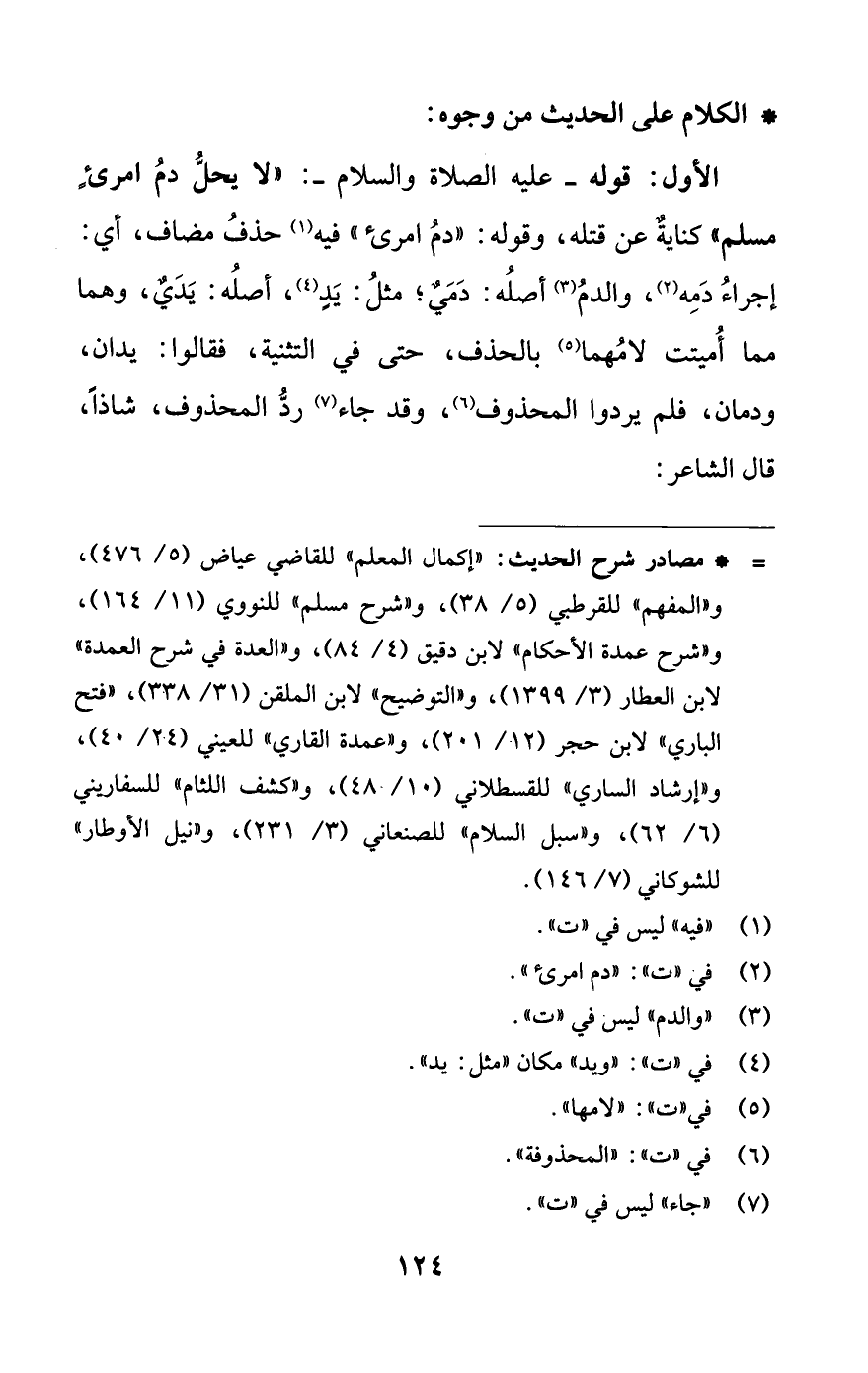 الأول: قوله -عليه الصلاة والسلام-: "لا يحلُّ دمُ امرىءٍ مسلم" كنايةٌ عن قتله، وقوله: "دمُ امرىء" فيه (¬1) حذفُ مضاف، أي: إجراءُ دَمِه (¬2)، والدمُ (¬3) أصلُه: دَمَيٌ؛ مثلُ: يَدٍ (¬4)، أصلُه: يَدَيٌ، وهما مما أُميتت لامُهما (¬5) بالحذف، حتى في التثنية، فقالوا: يدان، ودمان، فلم يردوا المحذوف (¬6)، وقد جاء (¬7) ردُّ المحذوف، شاذًا، قال الشاعر: