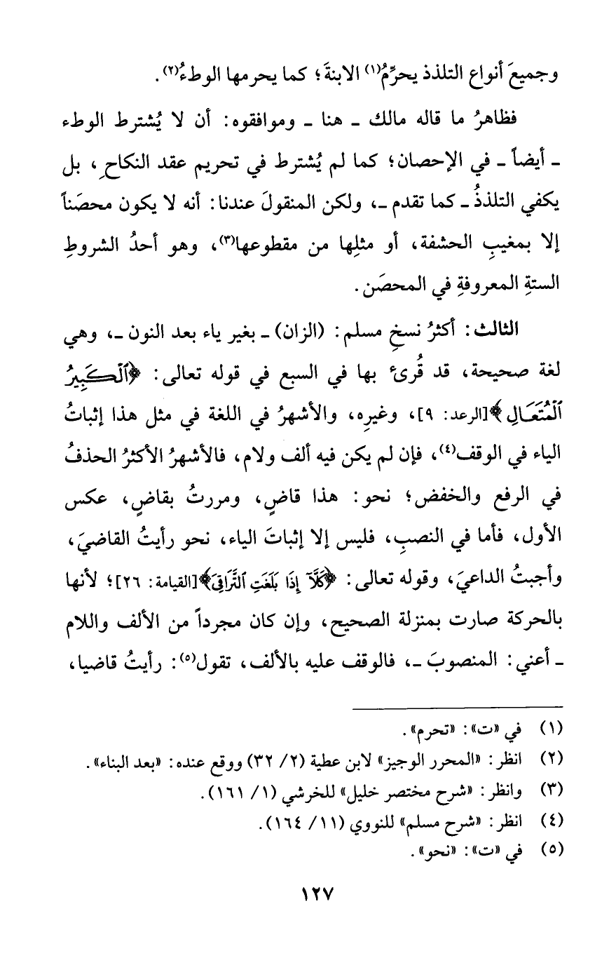 الثالث: أكثرُ نسخِ مسلم: (الزان) -بغير ياء بعد النون-، وهي لغة صحيحة، قد قُرىء بها في السبع في قوله تعالى: {الْكَبِيرُ الْمُتَعَالِ} [الرعد: 9]، وغيرِه، والأشهرُ في اللغة في مثل هذا إثباتُ الياء في الوقف (¬4)، فإن لم يكن فيه ألف ولام، فالأشهرُ الأكثرُ الحذفُ في الرفع والخفض؛ نحو: هذا قاضٍ، ومررتُ بقاضٍ، عكس الأول، فأما في النصبِ، فليس إلا إثباتَ الياء، نحو رأيتُ القاضيَ، وأجبتُ الداعيَ، وقوله تعالى: {كَلَّا إِذَا بَلَغَتِ التَّرَاقِيَ} [القيامة: 26]؛ لأنها بالحركة صارت بمنزلة الصحيح، وإن كان مجردًا من الألف واللام -أعني: المنصوبَ-، فالوقف عليه بالألف، تقول (¬5): رأيتُ قاضيا،