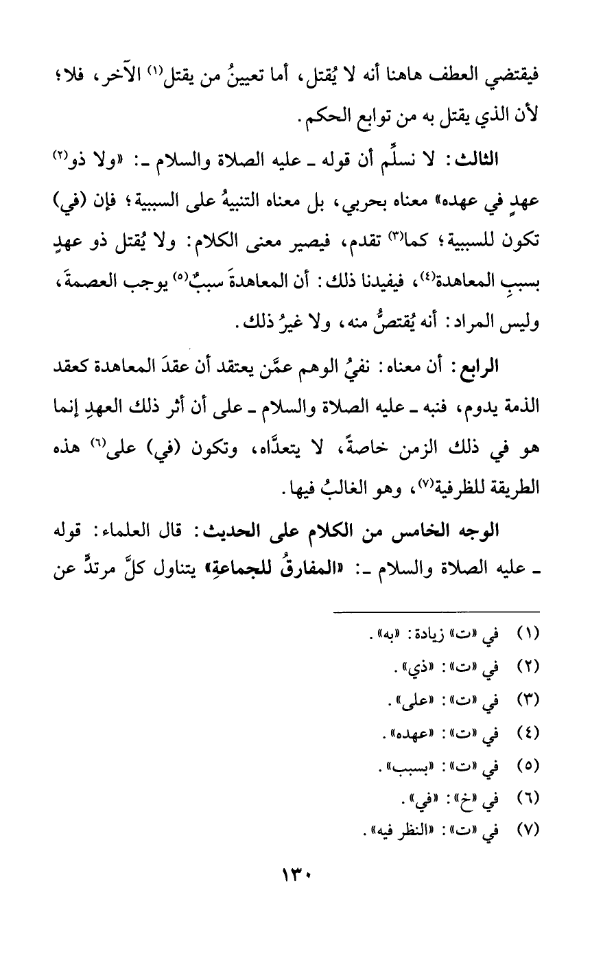 الثالث: لا نسلِّم أن قوله -عليه الصلاة والسلام-: "ولا ذو (¬2) عهدٍ في عهده" معناه بحربي، بل معناه التنبيهُ على السببية؛ فإن (في) تكون للسببية؛ كما (¬3) تقدم، فيصير معنى الكلام: ولا يُقتل ذو عهدٍ بسببِ المعاهدة (¬4)، فيفيدنا ذلك: أن المعاهدةَ سببٌ (¬5) يوجب العصمةَ، وليس المراد: أنه يُقتصُّ منه، ولا غيرُ ذلك.