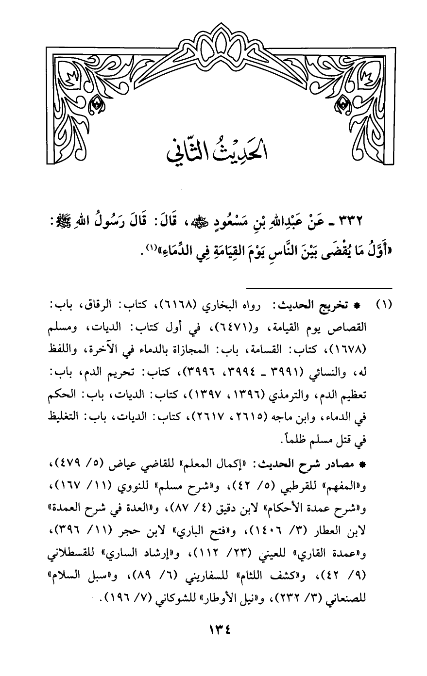 332 - عَنْ عَبْدِ اللَّهِ بْنِ مَسْعُودٍ -رضي اللَّه عنه-، قَالَ: قَالَ رَسُولُ اللَّهِ -صلى اللَّه عليه وسلم-: "أَوَّلُ مَا يُقْضَى بَيْنَ النَّاسِ يَوْمَ القِيَامَةِ فِي الدِّمَاءِ" (¬1).