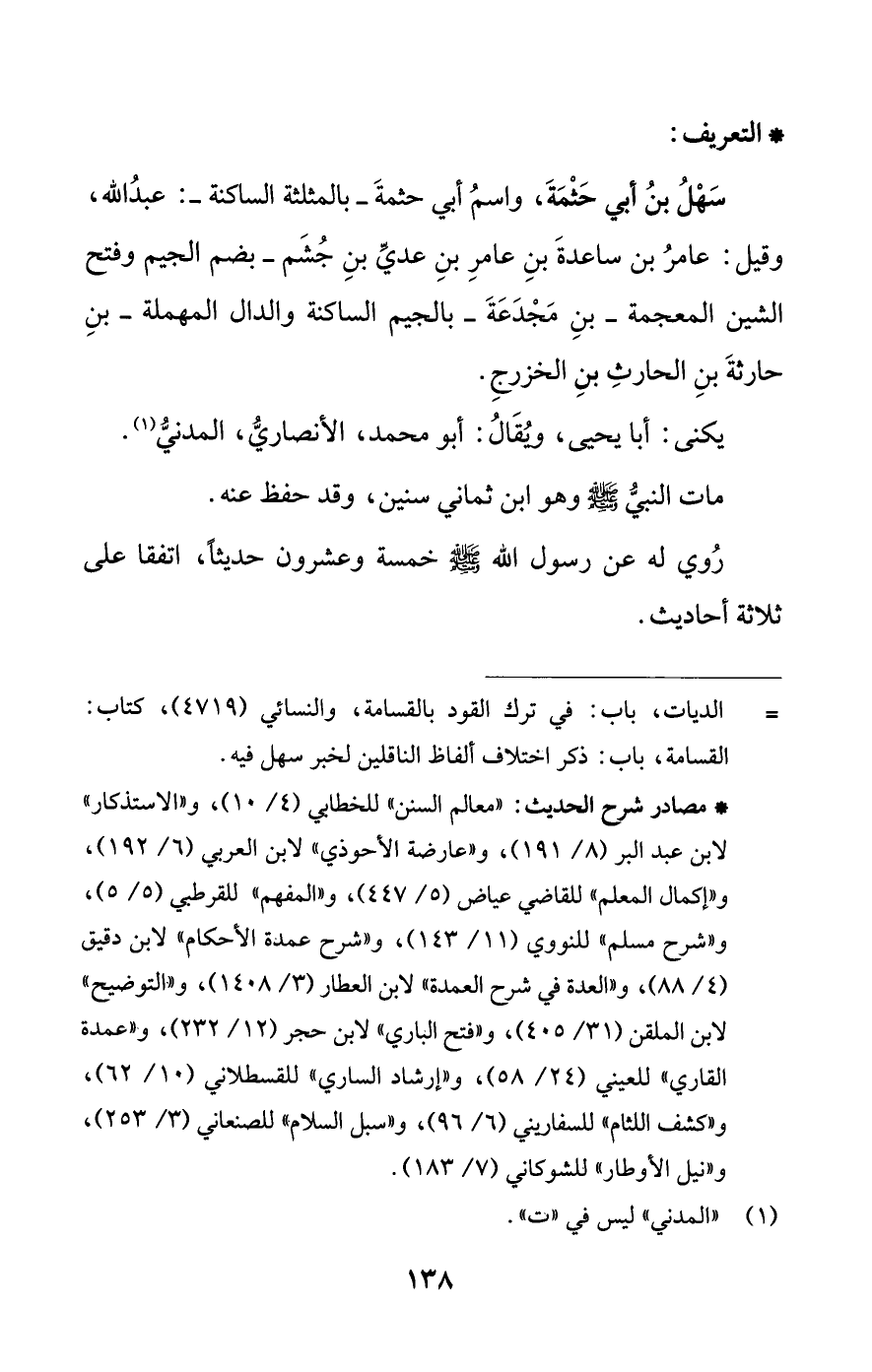 سَهْلُ بنُ أبي حَثْمَةَ، واسمُ أبي حثمةَ -بالمثلثة الساكنة-: عبدُ اللَّه، وقيل: عامرُ بن ساعدةَ بنِ عامرِ بنِ عديِّ بنِ جُشَم -بضم الجيم وفتح الشين المعجمة- بنِ مَجْدَعَةَ -بالجيم الساكنة والدال المهملة- بنِ حارثةَ بنِ الحارثِ بنِ الخزرجِ.