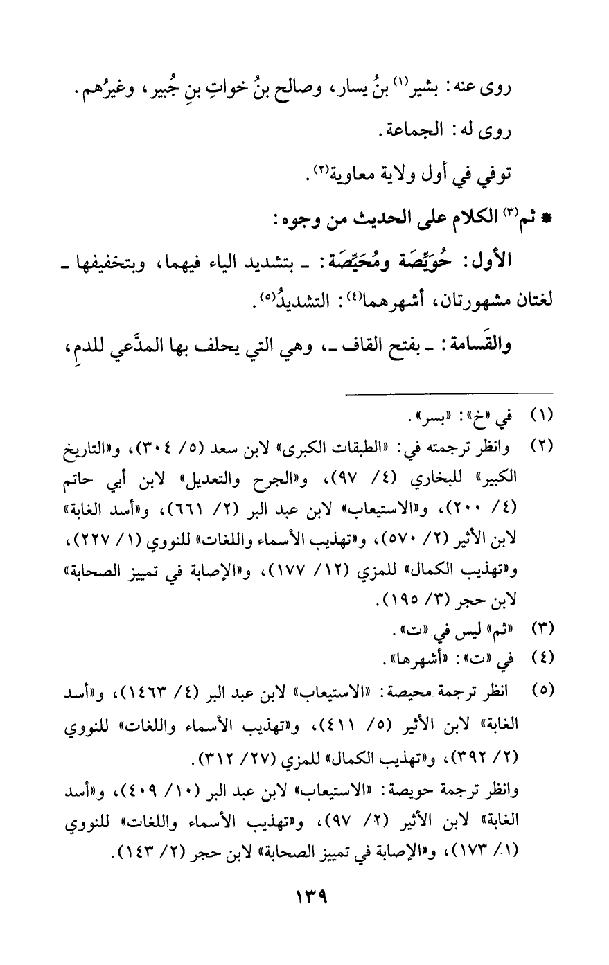 (¬5) انظر ترجمة محيصة: "الاستيعاب" لابن عبد البر (4/ 1463)، و"أسد الغابة" لابن الأثير (5/ 411)، و"تهذيب الأسماء واللغات" للنووي (2/ 392)، و"تهذيب الكمال" للمزي (27/ 312).