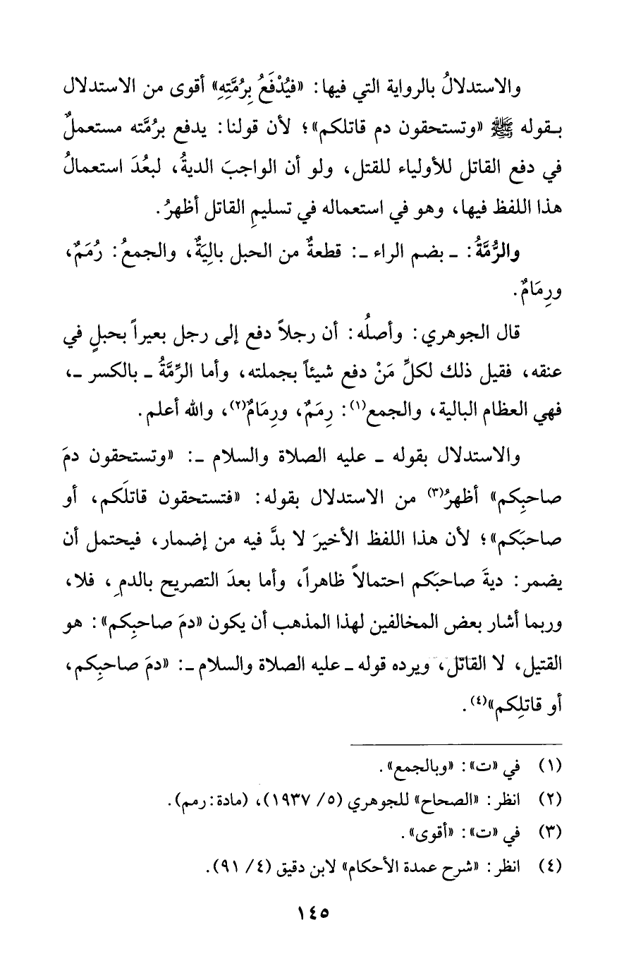 والاستدلالُ بالرواية التي فيها: "فيُدْفَعُ بِرُمَّتِهِ" أقوى من الاستدلال بقوله -صلى اللَّه عليه وسلم- "وتستحقون دم قاتلكم"؛ لأن قولنا: يدفع برُمَّته مستعملٌ في دفع القاتل للأولياء للقتل، ولو أن الواجبَ الديةُ، لبعُدَ استعمالُ هذا اللفظ فيها، وهو في استعماله في تسليمِ القاتل أظهرُ.