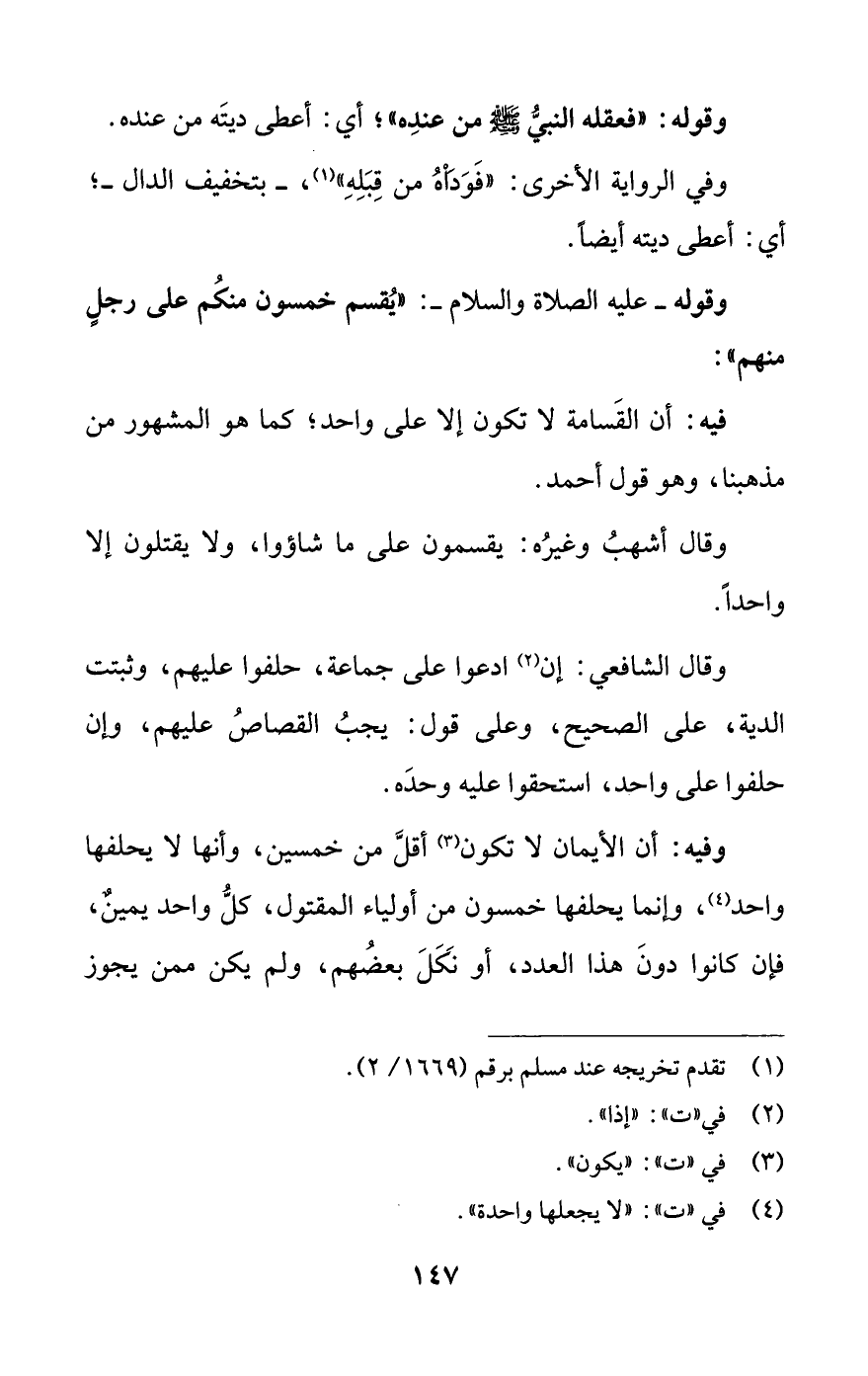 وفيه: أن الأيمان لا تكون (¬3) أقلَّ من خمسين، وأنها لا يحلفها واحد (¬4)، وإنما يحلفها خمسون من أولياء المقتول، كلُّ واحد يمينٌ، فإن كانوا دونَ هذا العدد، أو نَكَلَ بعضُهم، ولم يكن ممن يجوز