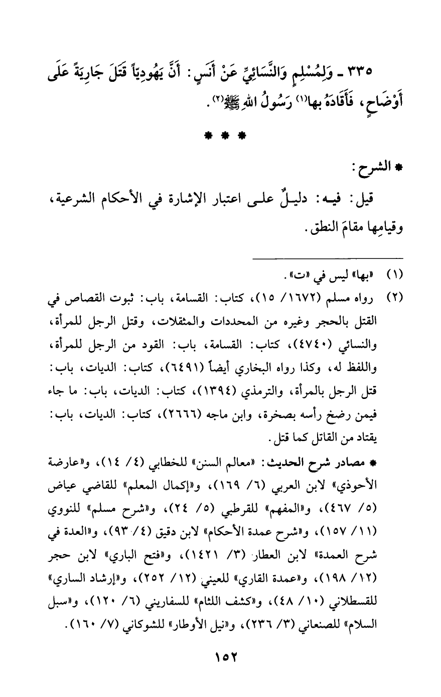 335 - وَلِمُسْلِمٍ وَالنَّسَائِيِّ عَنْ أَنَسٍ: أَنَّ يَهُودِيًّا قَتَلَ جَارِيَةً عَلَى أَوْضَاحٍ، فَأَقَادَهُ بها (¬1) رَسُولُ اللَّهِ -صلى اللَّه عليه وسلم- (¬2).