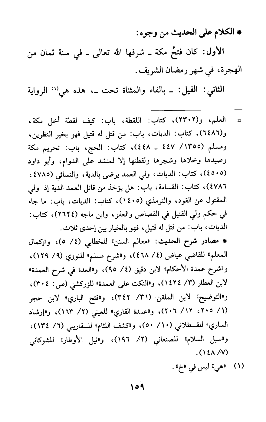 = العلم، و (2302)، كتاب: اللقطة، باب: كيف لقطة أخل مكة، و (6486)، كتاب: الديات، باب: من قتل له قتيل فهو بخير النظرين، ومسلم (1355/ 447 - 448)، كتاب: الحج، باب: تحريم مكة وصيدها وخلاها وشجرها ولقطتها إلا لمنشد على الدوام، وأبو داود (4505)، كتاب: الديات، ولي العمد يرضى بالدية، والنسائي (4785، 4786)، كتاب: القسامة، باب: هل يؤخذ من قاتل العمد الدية إذ ولي المقتول عن القود، والترمذي (1405)، كتاب: الديات، باب: ما جاء في حكم ولي القتيل في القصاص والعفو، وابن ماجه (2624)، كتاب: الديات، باب: من قتل له قتيل، فهو بالخيار بين إحدى ثلاث.