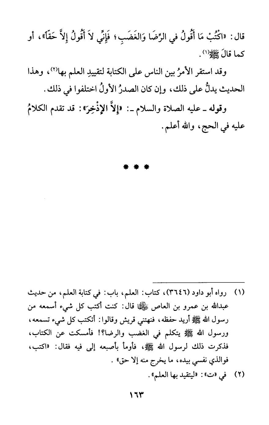 (¬1) رواه أبو داود (3646)، كتاب: العلم، باب: في كتابة العلم، من حديث عبد اللَّه بن عمرو بن العاص -رضي اللَّه عنهما- قال: كنت أكتب كل شيء أسمعه من رسول اللَّه -صلى اللَّه عليه وسلم- أريد حفظه، فنهتني قريش وقالوا: أتكتب كل شيء تسمعه، ورسول اللَّه -صلى اللَّه عليه وسلم- يتكلم في الغضب والرضا؟! فأمسكت عن الكتاب، فذكرت ذلك لرسول اللَّه -صلى اللَّه عليه وسلم-، فأومأ بأصبعه إلى فيه فقال: "اكتب، فوالذي نفسي بيده، ما يخرج منه إلا حق".