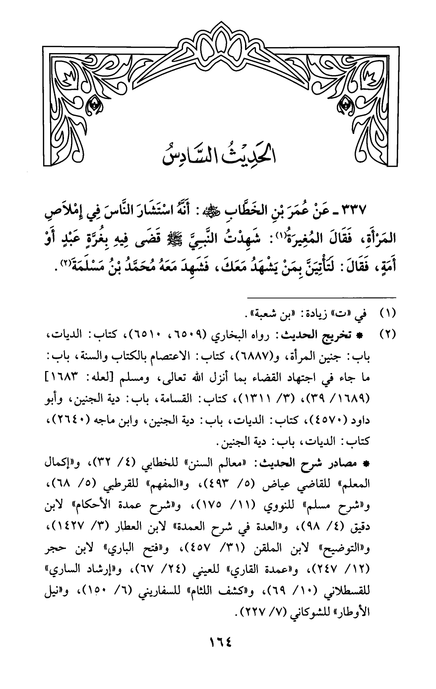337 - عَنْ عُمَرَ بْنِ الخَطَّابِ -رضي اللَّه عنه-: أَنَّهُ اسْتَشَارَ النَّاسَ فِي إِمْلَاصِ المَرْأَةِ، فَقَالَ المُغِيرَةُ (¬1): شَهِدْتُ النَّبِيَّ -صلى اللَّه عليه وسلم- قَضَى فِيهِ بِغُرَّةٍ عَبْدٍ أَوْ أَمَةٍ، فَقَالَ: لَتأْتِيَنَّ بِمَنْ يَشْهَدُ مَعَكَ، فَشَهِدَ مَعَهُ مُحَمَّدُ بْنُ مَسْلَمَةَ (¬2).