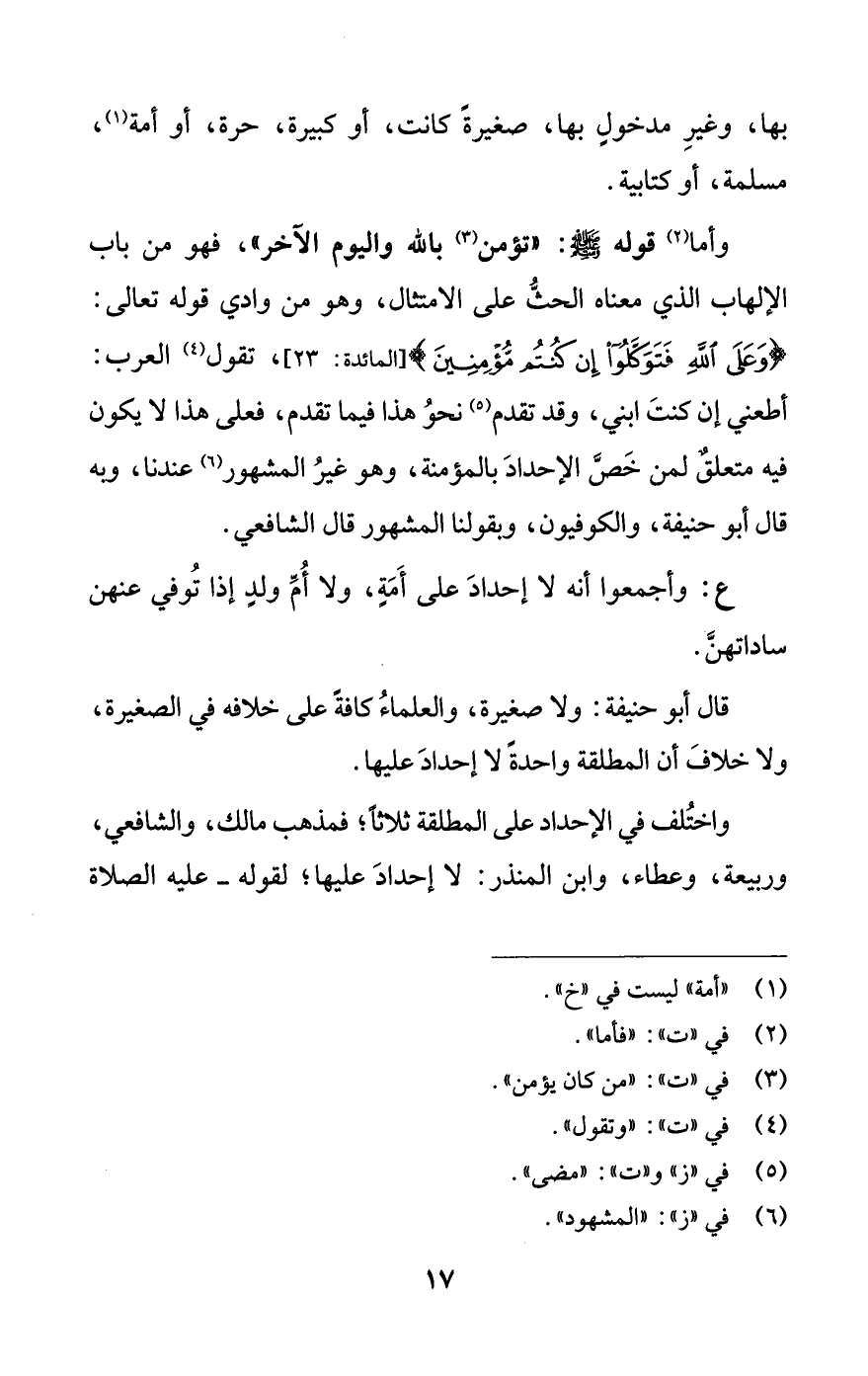 وأما (¬2) قوله -صلى اللَّه عليه وسلم-: "تؤمن (¬3) باللَّه واليوم الآخر"، فهو من باب الإلهاب الذي معناه الحثُّ على الامتثال، وهو من وادي قوله تعالى: {وَعَلَى اللَّهِ فَتَوَكَّلُوا إِنْ كُنْتُمْ مُؤْمِنِينَ} [المائدة: 23]، تقول (¬4) العرب: أطعني إن كنتَ ابني، وقد تقدم (¬5) نحوُ هذا فيما تقدم، فعلى هذا لا يكون فيه متعلقٌ لمن خَصَّ الإحدادَ بالمؤمنة، وهو غيرُ المشهور (¬6) عندنا، وبه قال أبو حنيفة، والكوفيون، وبقولنا المشهور قال الشافعي.