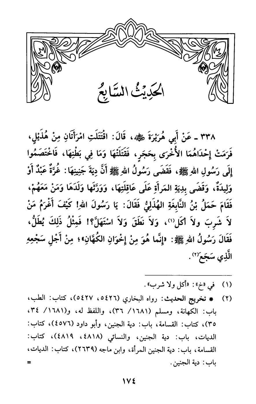 338 - عَنْ أَبِي هُرَيْرَةَ -رضي اللَّه عنه-، قَالَ: اقْتَتَلَتِ امْرَأَتَانِ مِنْ هُذَيْلٍ، فَرَمَتْ إِحْدَاهُمَا الأُخْرَى بِحَجَرٍ، فَقَتَلَتْهَا وَمَا فِي بَطْنِهَا، فَاخْتَصَمُوا إِلَى رَسُولِ اللَّهِ -صلى اللَّه عليه وسلم-، فَقَضَى رَسُولُ اللَّهِ -صلى اللَّه عليه وسلم- أَنَّ دِيَةَ جَنِييهَا: غُرَّة عَبْدٌ أَوْ وَلِيدَةٌ، وَقَضَى بِدِيَةِ المَرأَةِ عَلَى عَاقِلَتِهَا، وَوَرَّثَها وَلَدَهَا وَمَنْ مَعَهُمْ، فَقَامَ حَمَلُ بْنُ النَّابِغَةِ الهُذَلِيُّ فَقَالَ: يَا رَسُولَ اللَّهِ! كيْفَ أَغْرَمُ مَنْ لَا شَرِبَ ولَا أَكَل (¬1)، وَلَا نَطَقَ وَلَا اسْتَهَلَّ؛! فَمِثْلُ ذَلِكَ يُطَلُّ، فَقَالَ رَسُولُ اللَّهِ -صلى اللَّه عليه وسلم-: "إِنَّما هُوَ مِنْ إِخْوَانِ الكُهَّانِ"؛ مِنْ أَجْلِ سَجْعِهِ الَّذِي سَجَعَ (¬2).