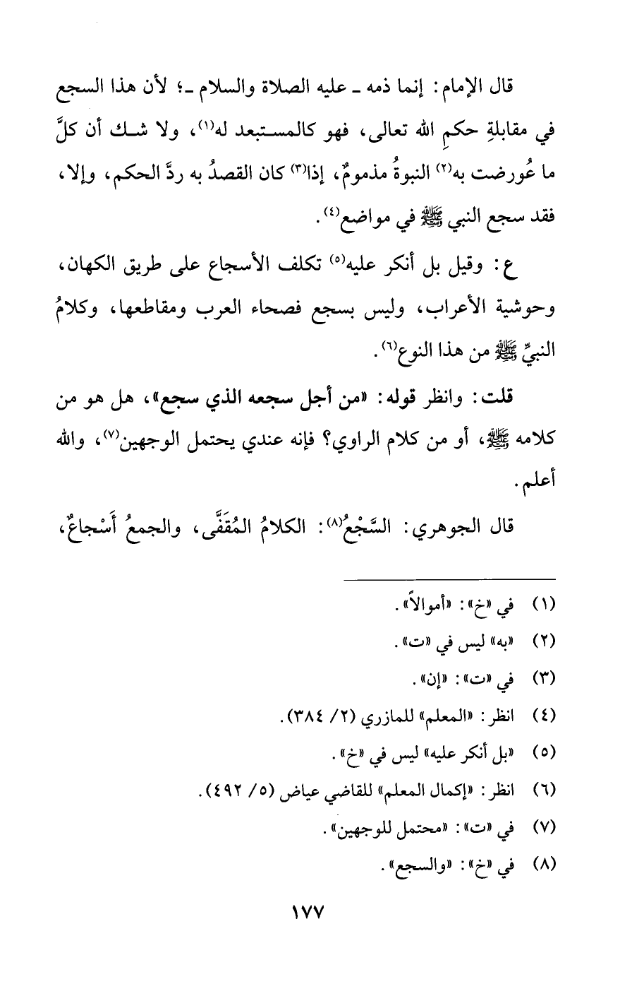 ع: وقيل بل أنكر عليه (¬5) تكلف الأسجاع على طريق الكهان، وحوشية الأعراب، وليس بسجع فصحاء العرب ومقاطعها، وكلامُ النبيِّ -صلى اللَّه عليه وسلم- من هذا النوع (¬6).