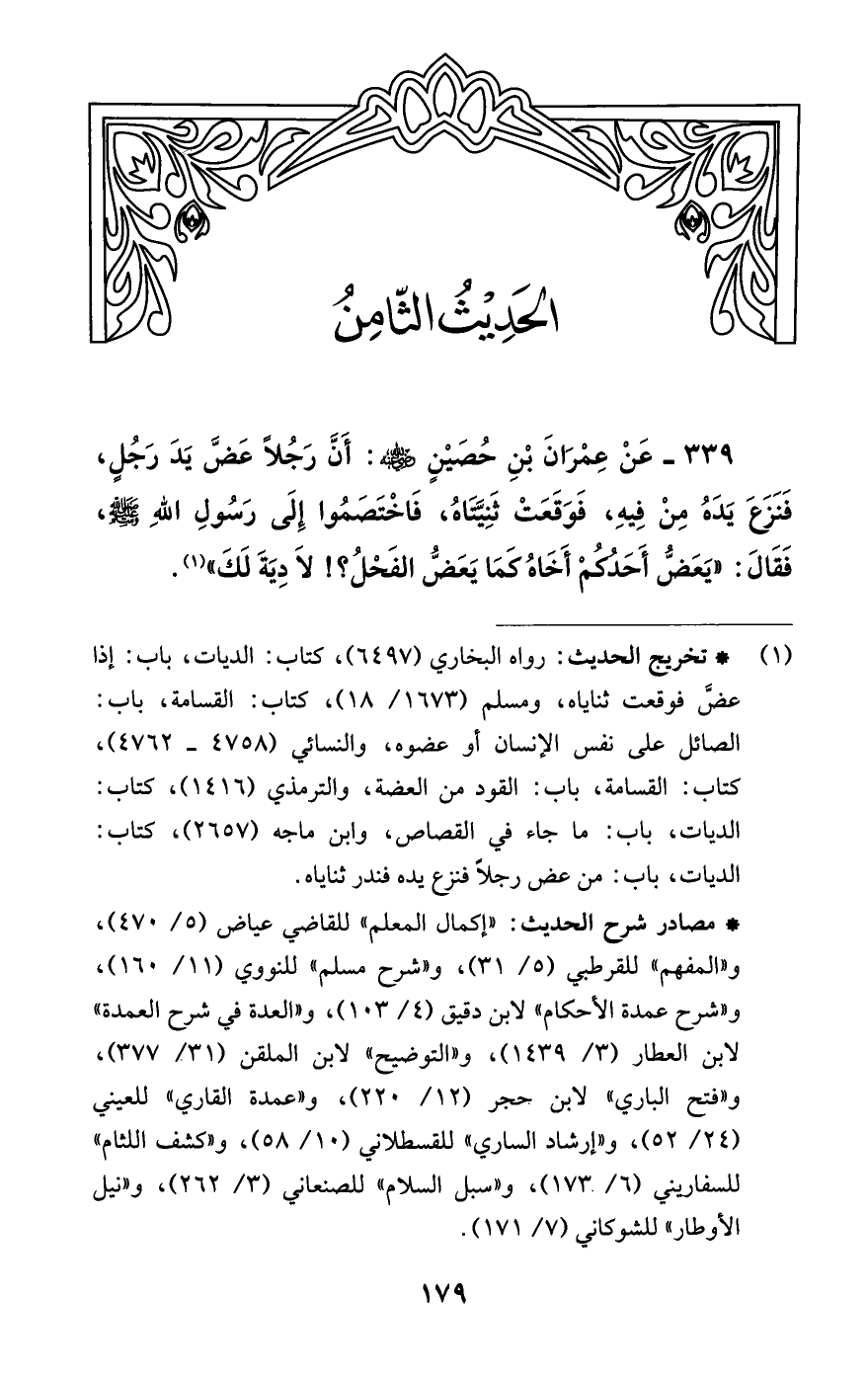 339 - عَنْ عِمْرَانَ بْنِ حُصَيْنٍ -رضي اللَّه عنه-: أَنَّ رَجُلًا عَضَّ يَدَ رَجُلٍ، فَنَزَعَ يَدَهُ مِنْ فِيهِ، فَوَقَعَتْ ثَنِيَّتَاهُ، فَاخْتَصَمُوا إِلَى رَسُولِ اللَّهِ -صلى اللَّه عليه وسلم-، فَقَالَ: "يَعَضُّ أَحَدُكُمْ أَخَاهُ كَمَا يَعَضُّ الفَحْلُ؟! لَا دِيَةَ لَكَ" (¬1).