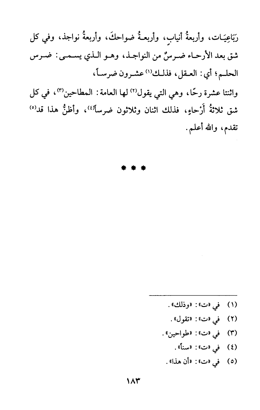 واثنتا عشرة رحًا، وهي التي يقول (¬2) لها العامة: المطاحين (¬3)، في كل شق ثلاثةُ أَرْحاءِ، فذلك اثنان وثلاثون ضرسًا (¬4)، وأظنُّ هذا قد (¬5) تقدم، واللَّه أعلم.
