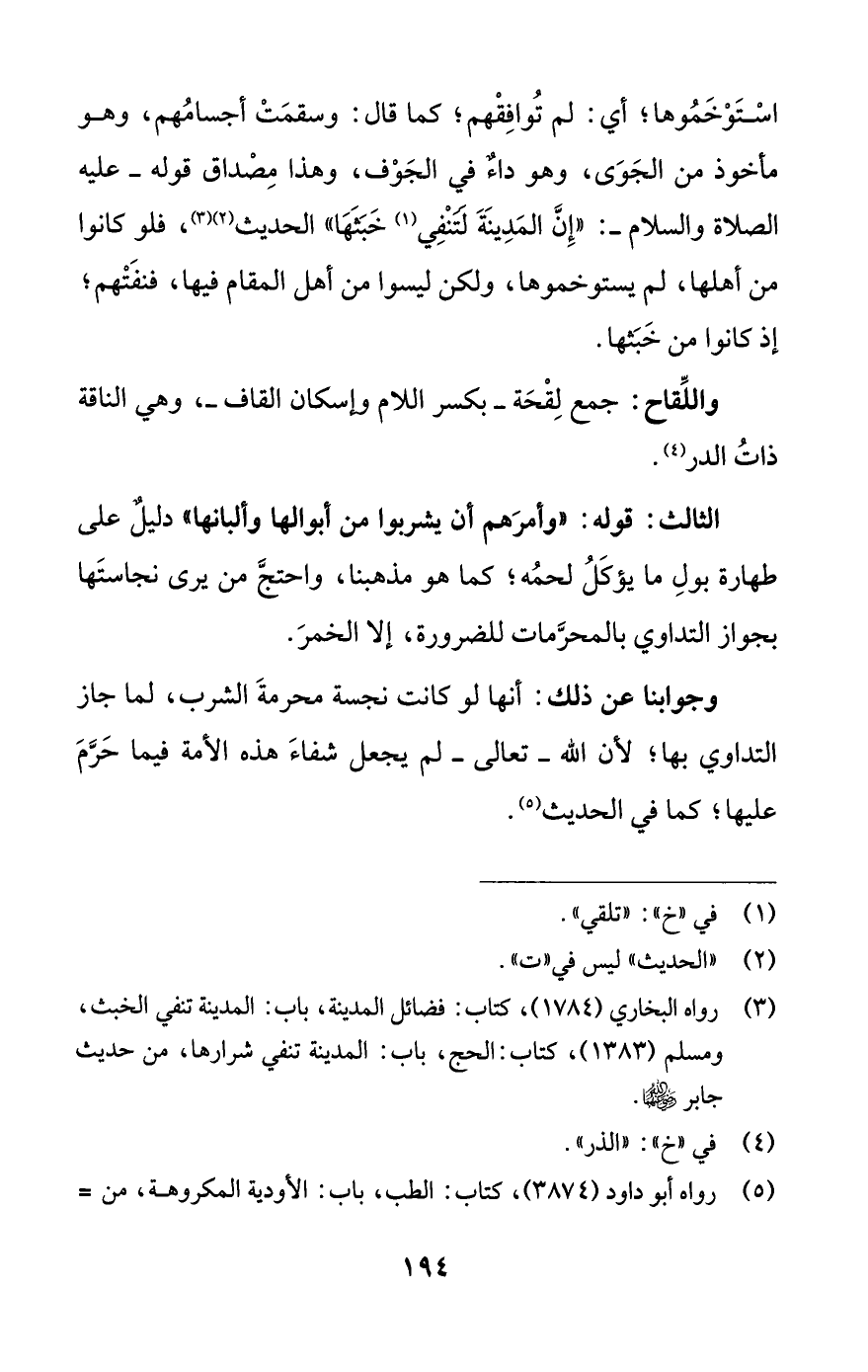 وجوابنا عن ذلك: أنها لو كانت نجسة محرمةَ الشرب، لما جاز التداوي بها؛ لأن اللَّه -تعالى- لم يجعل شفاءَ هذه الأمة فيما حَرَّمَ عليها؛ كما في الحديث (¬5).