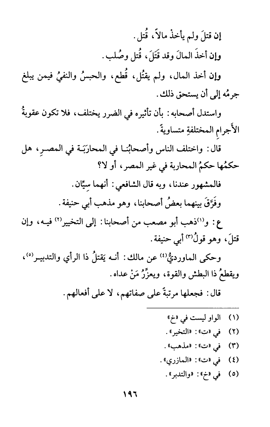 قال: واختلف الناس وأصحابُنا في المحارَبَة في المصرِ، هل حكمُها حكمُ المحاربة في غير المصر، أو لا؟