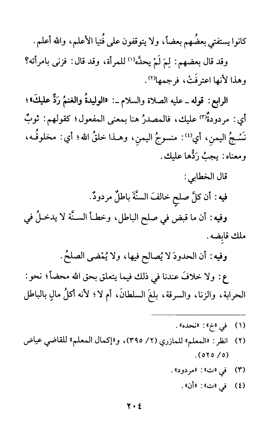 الرابع: قوله -عليه الصلاة والسلام-: "الوليدةُ والغنمُ رَدٌّ عليكَ"؛ أي: مردودةٌ (¬3) عليك، فالمصدرُ هنا بمعنى المفعول؛ كقولهم: ثوبٌ نَسْجُ اليمنِ، أي (¬4): منسوجُ اليمنِ، وهذا خلقُ اللَّه؛ أي: مخلوقُه، ومعناه: يجبُ رَدُّها عليك.