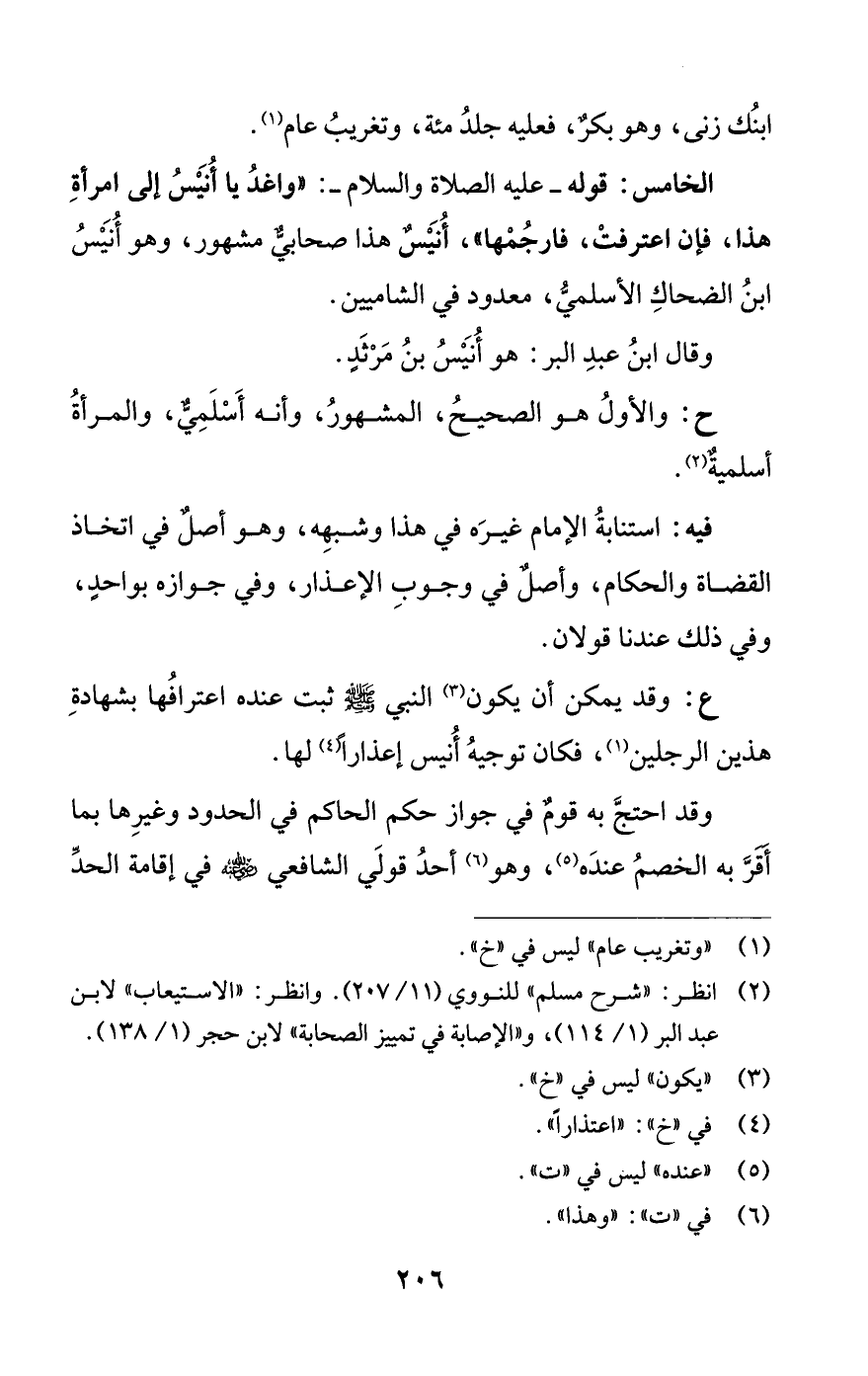 ع: وقد يمكن أن يكون (¬3) النبي -صلى اللَّه عليه وسلم- ثبت عنده اعترافُها بشهادةِ هذين الرجلين (1)، فكان توجيهُ أُنيس إعذارًا (¬4) لها.