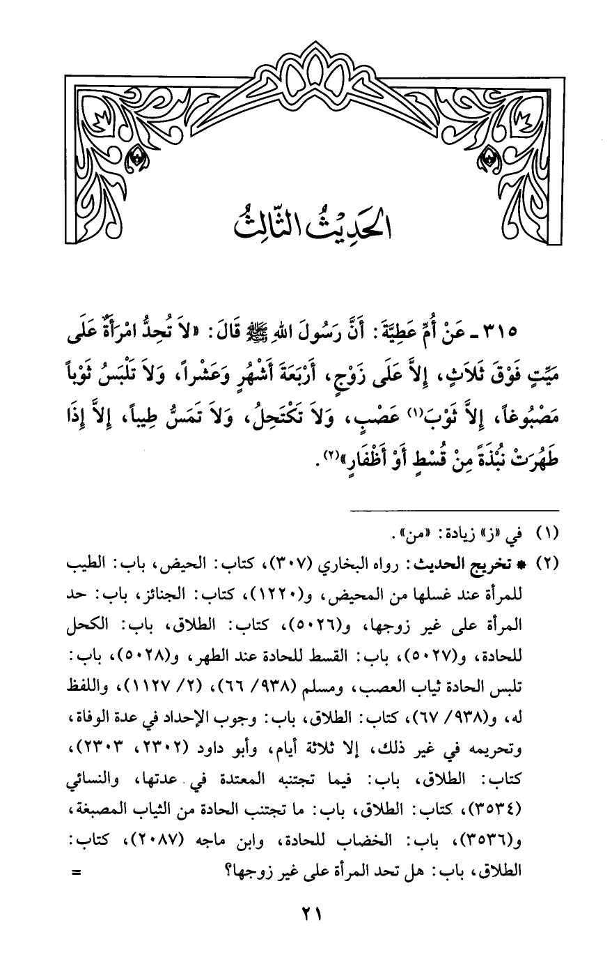 315 - عَنْ أُمِّ عَطِيَّةَ: أَنَّ رَسُولَ اللَّهِ -صلى اللَّه عليه وسلم- قَالَ: "لَا تُحِدُّ امْرَأةٌ عَلَى مَيِّتٍ فَوْقَ ثَلَاثٍ، إِلَّا عَلَى زَوْجٍ، أَرْبَعَةَ أَشْهُرٍ وَعَشْرًا، وَلَا تَلْبَسُ ثَوْبًا مَصْبُوغًا، إِلَّا ثَوْبَ (¬1) عَصْبٍ، وَلَا تَكْتَحِلُ، وَلَا تَمَسُّ طِيبًا، إِلَّا إِذَا طَهُرَتْ نُبذَةً مِنْ قُسْطٍ أَوْ أَظْفَارٍ" (¬2).