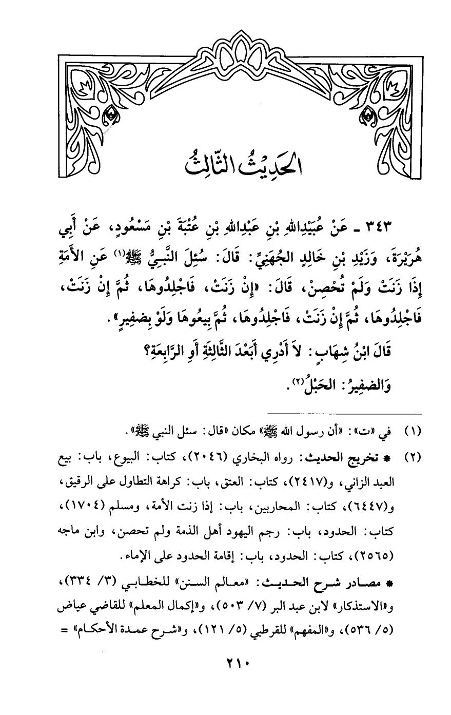 343 - عَنْ عُبَيْدِ اللَّهِ بْنِ عَبْدِ اللَّهِ بْنِ عُتْبه بْنِ مَسْعُودٍ، عَنْ أَبِي هُرَيرَةَ، وَزيدِ بن خَالِدٍ الجُهَنِيِّ: قَالَ: سُئِلَ النَّبِيُّ -صلى اللَّه عليه وسلم- (¬1) عَنِ الأَمَةِ إِذَا زنَتْ وَلَمْ تُحْصِنْ، قَالَ: "إِنْ زَنَتْ، فَاجْلِدُوهَا، ثُمَّ إِنْ زَنَتْ، فَاجْلِدُوهَا، ثُمَّ إِنْ زَنَتْ، فَاجْلِدُوهَا، ثُمَّ بِيعُوهَا وَلَوْ بِضفِيرٍ".