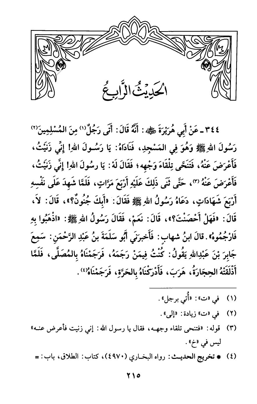 344 - عَنْ أَبِي هُرَيْرَةَ -رضي اللَّه عنه-: أنه قَالَ: أتَى رَجُل (¬1) مِنَ المُسْلِمِينَ (¬2) رَسُولَ اللَّهِ -صلى اللَّه عليه وسلم- وَهُوَ فِي المَسْجِدِ، فَنَاداهُ: يَا رَسُولَ اللَّهِ إِنِّي زَنَيْتُ، فَأعْرَضَ عَنْهُ، فتَنَحَّى تِلْقَاءَ وَجْهِه؛ فَقَالَ لَهْ: يَا رسُولَ اللَّهِ إِنَّي زَنَيْتُ، فَأَعْرَضَ عَنْهُ (¬3)، حَتَّى ثَنَى ذَلِكَ عَلَيْهِ أَرْبَعَ مَرَّاتٍ، فَلَمَّا شَهِدَ عَلَى نَفْسِهِ أَرْبَعَ شَهَاداتٍ، دَعَاهُ رَسُولُ اللَّهِ -صلى اللَّه عليه وسلم- فَقَالَ: "أبِكَ جُنُونٌ؟ "، قَالَ: لَا، قَالَ: "فَهَلْ أَحْصَنْتَ؟ "، قَالَ: نَعَمْ، فَقَالَ رَسُولُ اللَّهِ -صلى اللَّه عليه وسلم-: "اذْهَبُوا بِهِ فَارْجُمُوهُ". قالَ ابنُ شهابٍ: فَأخبرَنَي أَبُو سَلَمَةَ بنُ عَبْدِ الرَّحْمَنِ: سَمِعَ جَابِرَ بْنَ عَبْدِ اللَّهِ يَقُولُ: كُنْتُ فِيمَنْ رَجَمَهُ، فَرَجَمْنَاهُ بِالمُصَلَّى، فَلَمَّا أَذْلَقَتْهُ الحِجَارَةُ، هَرَبَ، فَأَدْركْنَاهُ بِالحَرَّةِ، فَرَجَمْنَاهُ (¬4).