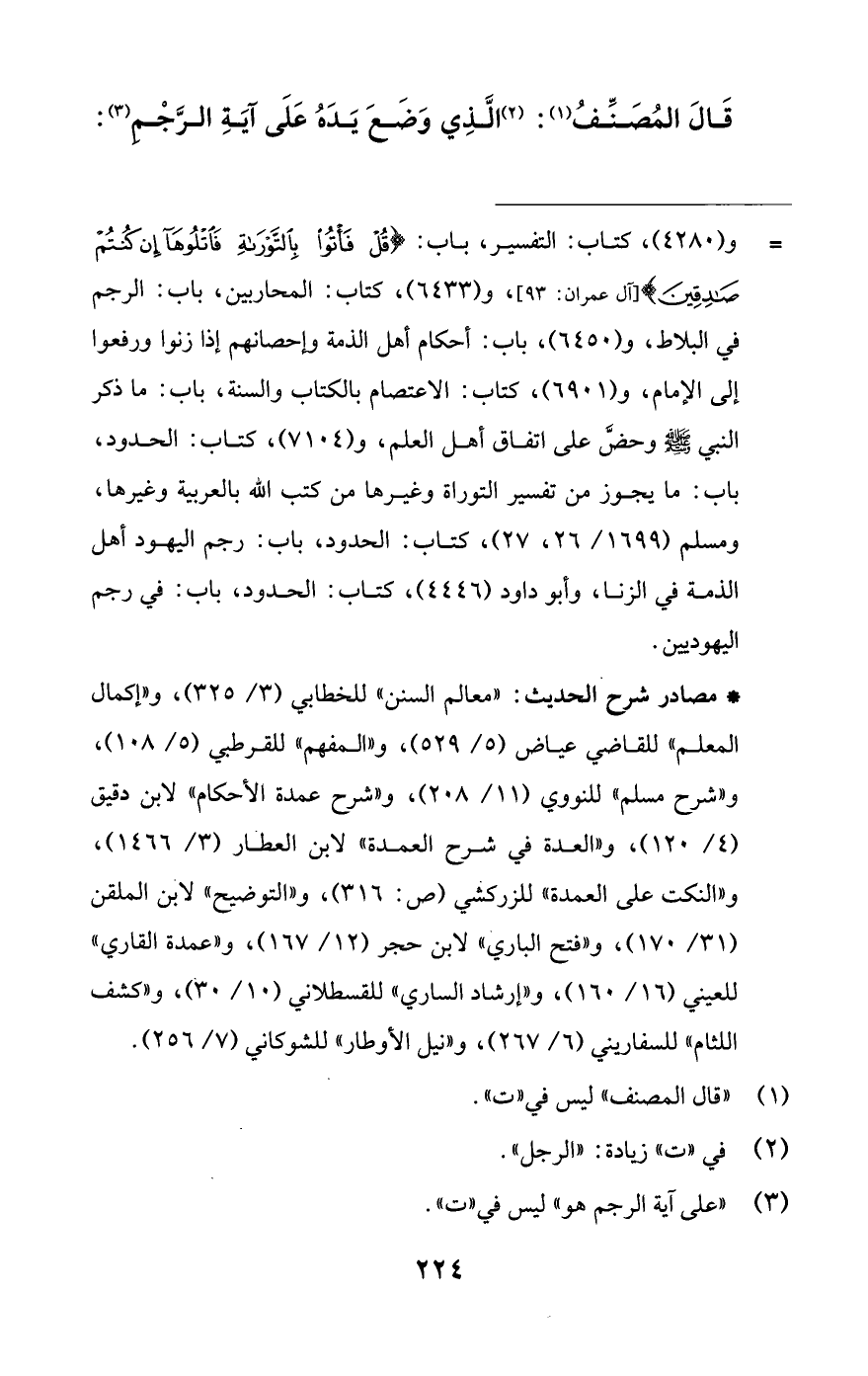 = و (4280)، كتاب: التفسير، باب: {قُلْ فَأْتُوا بِالتَّوْرَاةِ فَاتْلُوهَا إِنْ كُنْتُمْ صَادِقِينَ} [آل عمران: 93]، و (6433)، كتاب: المحاربين، باب: الرجم في البلاط، و (6450)، باب: أحكام أهل الذمة وإحصانهم إذا زنوا ورفعوا إلى الإمام، و (6901)، كتاب: الاعتصام بالكتاب والسنة، باب: ما ذكر النبي -صلى اللَّه عليه وسلم- وحضَّ على اتفاق أهل العلم، و (7104)، كتاب: الحدود، باب: ما يجوز من تفسير التوراة وغيرها من كتب اللَّه بالعربية وغيرها، ومسلم (1699/ 26، 27)، كتاب: الحدود، باب: رجم اليهود أهل الذمة في الزنا، وأبو داود (4446)، كتاب: الحدود، باب: في رجم اليهوديين.