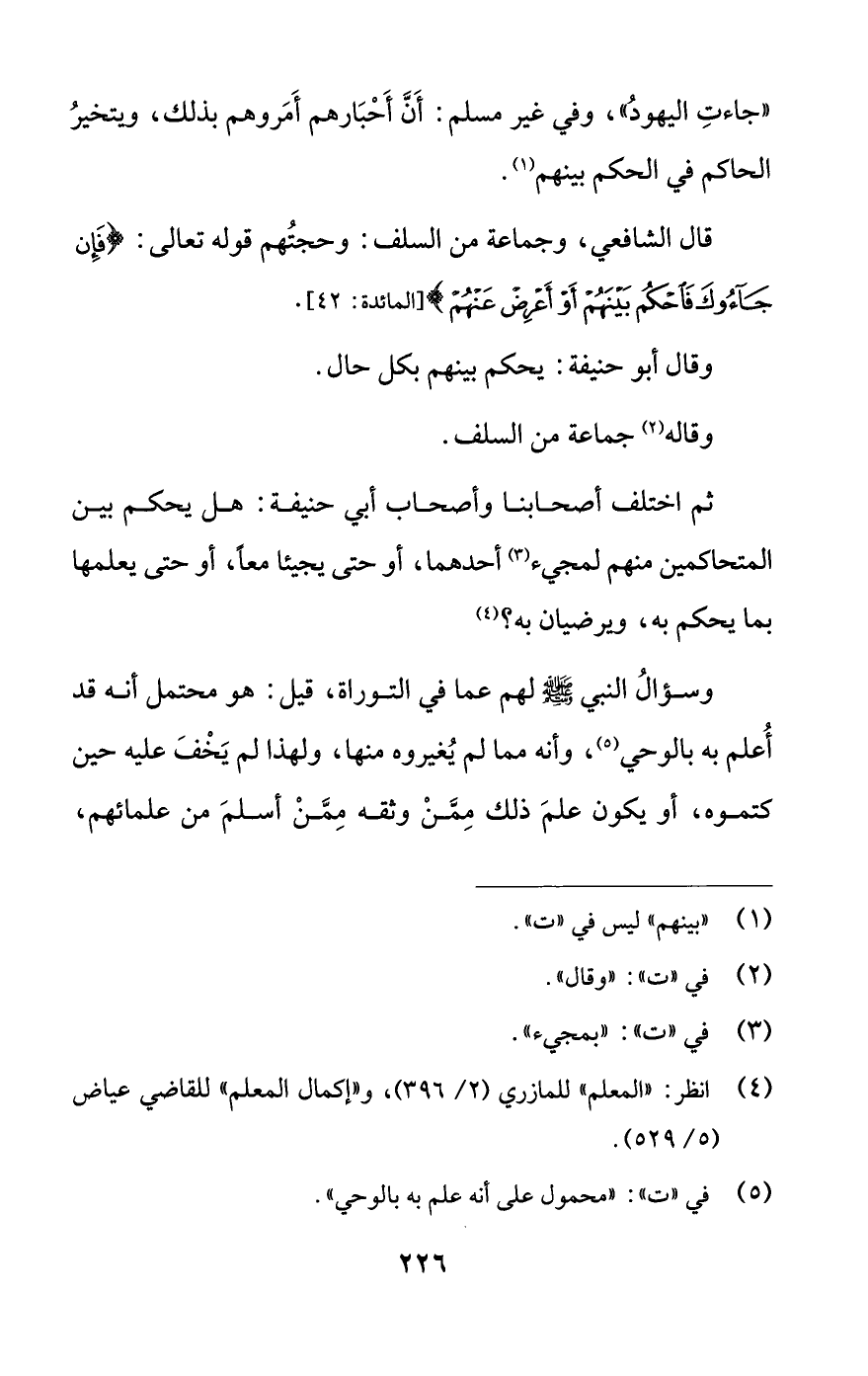 قال الشافعي، وجماعة من السلف: وحجتُهم قوله تعالى: {فَإِنْ جَاءُوكَ فَاحْكُمْ بَيْنَهُمْ أَوْ أَعْرِضْ عَنْهُمْ} [المائدة: 42].