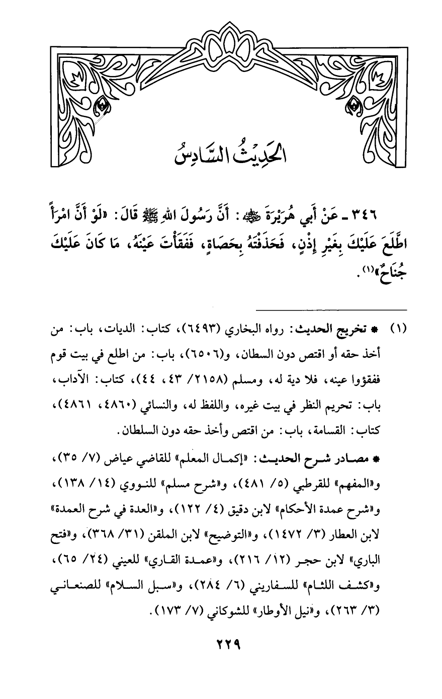 346 - عَنْ أَبِي هُرَيْرَةَ -رضي اللَّه عنه-: أَنَّ رَسُولَ اللَّهِ -صلى اللَّه عليه وسلم- قَالَ: "لَوْ أَنَّ امْرَأً اطَّلَعَ عَلَيْكَ بِغَيْرِ إِذْنٍ، فَحَذَفْتَهُ بِحَصَاةٍ، فَفَقَأْتَ عَيْنَهُ، مَا كَانَ عَلَيْكَ جُنَاحٌ" (¬1).