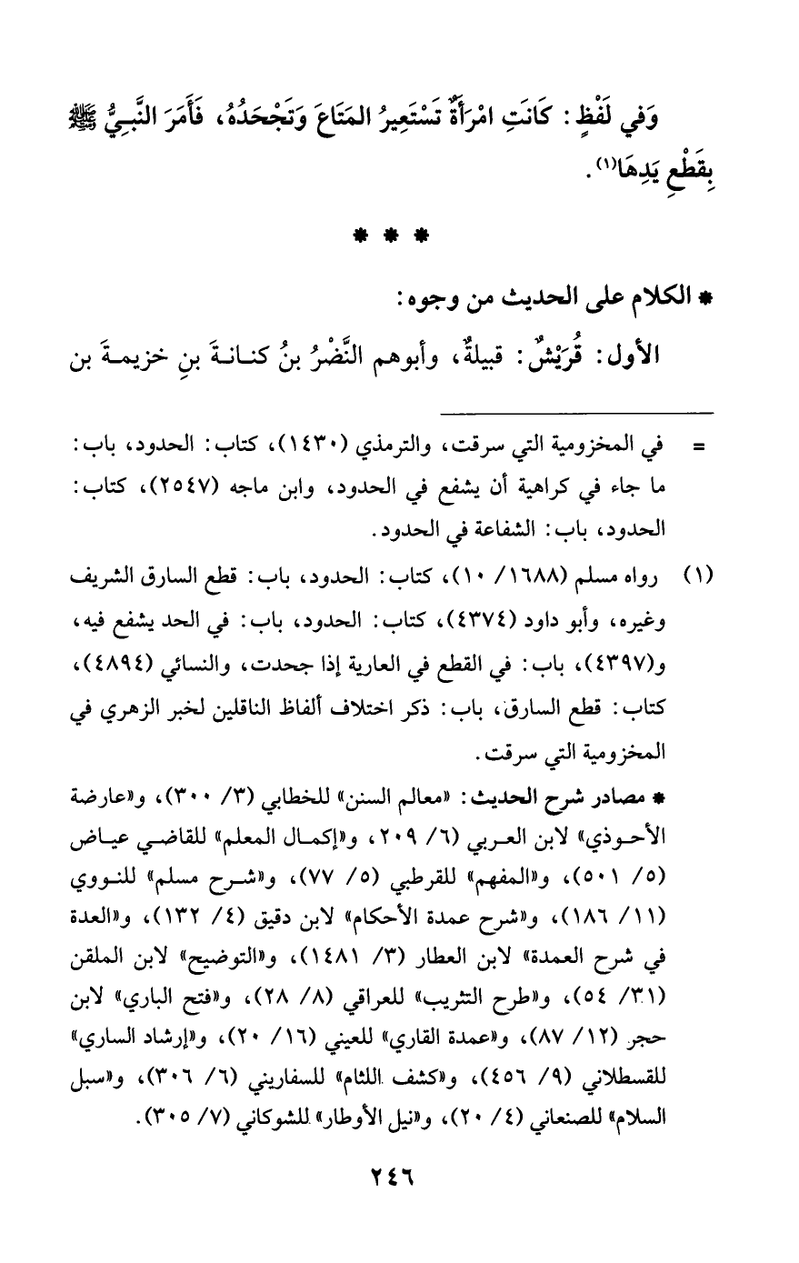 (¬1) رواه مسلم (1688/ 10)، كتاب: الحدود، باب: قطع السارق الشريف وغيره، وأبو داود (4374)، كتاب: الحدود، باب: في الحد يشفع فيه، و (4397)، باب: في القطع في العارية إذا جحدت، والنسائي (4894)، كتاب: قطع السارق، باب: ذكر اختلاف ألفاظ الناقلين لخبر الزهري في المخزومية التي سرقت.