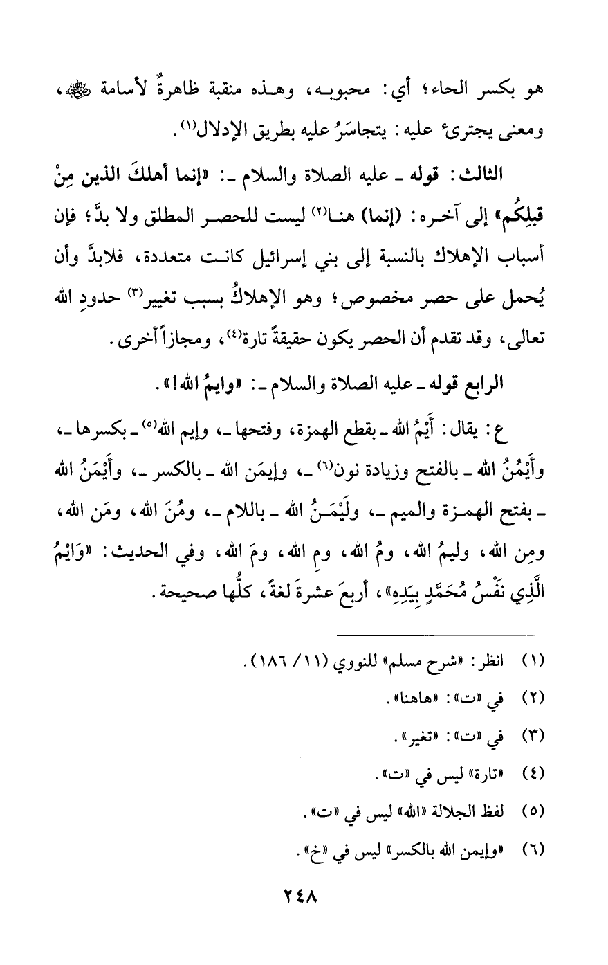 الثالث: قوله -عليه الصلاة والسلام-: "إنما أهلكَ الذين مِنْ قبلِكُم" إلى آخره: (إنما) هنا (¬2) ليست للحصر المطلق ولا بدَّ، فإن أسباب الإهلاك بالنسبة إلى بني إسرائيل كانت متعددة، فلابدَّ وأن يُحمل على حصر مخصوص؛ وهو الإهلاكُ بسبب تغيير (¬3) حدودِ اللَّه تعالى، وقد تقدم أن الحصر يكون حقيقةً تارة (¬4)، ومجازًا أخرى.