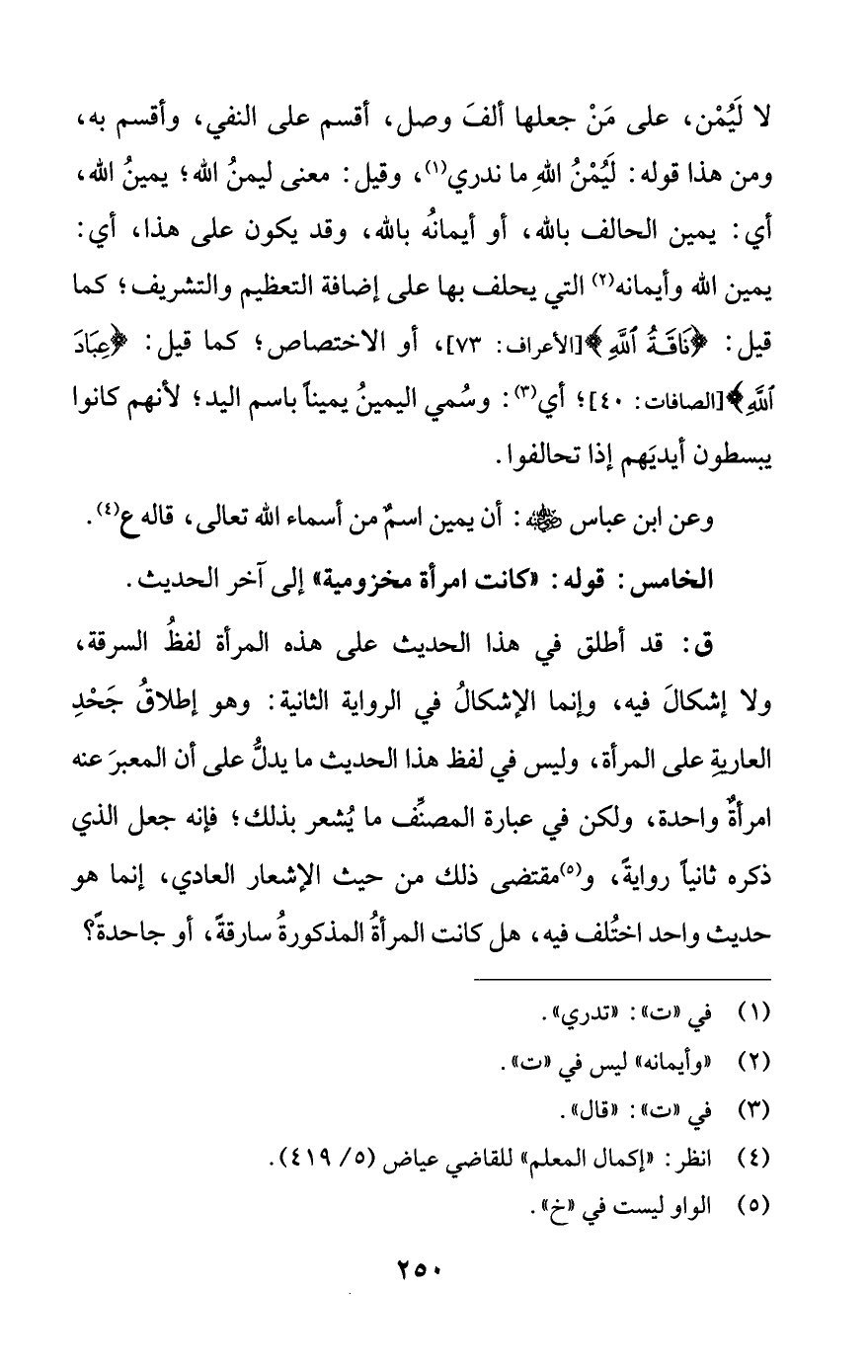 ق: قد أطلق في هذا الحديث على هذه المرأة لفظُ السرقة، ولا إشكالَ فيه، وإنما الإشكالُ في الرواية الثانية: وهو إطلاقُ جَحْدِ العاريةِ على المرأة، وليس في لفظ هذا الحديث ما يدلُّ على أن المعبرَ عنه امرأة واحدة، ولكن في عبارة المصنِّف ما يُشعر بذلك؛ فإنه جعل الذي ذكره ثانيًا روايةً، و (¬5) مقتضى ذلك من حيث الإشعار العادي، إنما هو حديث واحد اختُلف فيه، هل كانت المرأةُ المذكورةُ سارقةً، أو جاحدةً؟