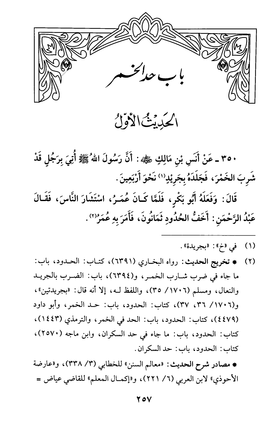 350 - عَنْ أَنَسِ بْنِ مَالِكٍ -رضي اللَّه عنه-: أَنَّ رَسُولَ اللَّهُ -صلى اللَّه عليه وسلم- أُتِيَ بِرَجُلٍ قَدْ شَرِبَ الخَمْرَ، فَجَلَدَهُ بِجَرِيْدٍ (¬1) نَحْوَ أَرْبَعِينَ.