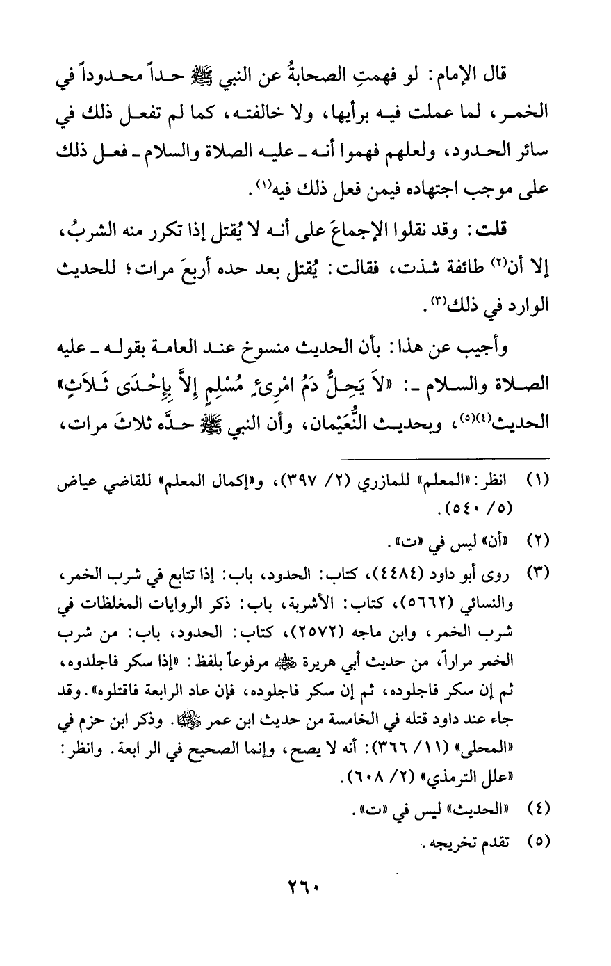 (¬3) روى أبو داود (4484)، كتاب: الحدود، باب: إذا تتابع في شرب الخمر، والنسائي (5662)، كتاب: الأشربة، باب: ذكر الروايات المغلظات في شرب الخمر، وابن ماجة (2572)، كتاب: الحدود، باب: من شرب الخمر مرارًا، من حديث أبي هريرة -رضي اللَّه عنه- مرفوعًا بلفظ: "إذا سكر فاجلدوه، ثم إن سكر فاجلوده، ثم إن سكر فاجلوده، فان عاد الرابعة فاقتلوه". وقد جاء عند داود قتله في الخامسة من حديث ابن عمر -رضي اللَّه عنهما-. وذكر ابن حزم في "المحلى" (11/ 366): أنه لا يصح، وإنما الصحيح في الرابعة. وانظر: "علل الترمذي" (2/ 608).