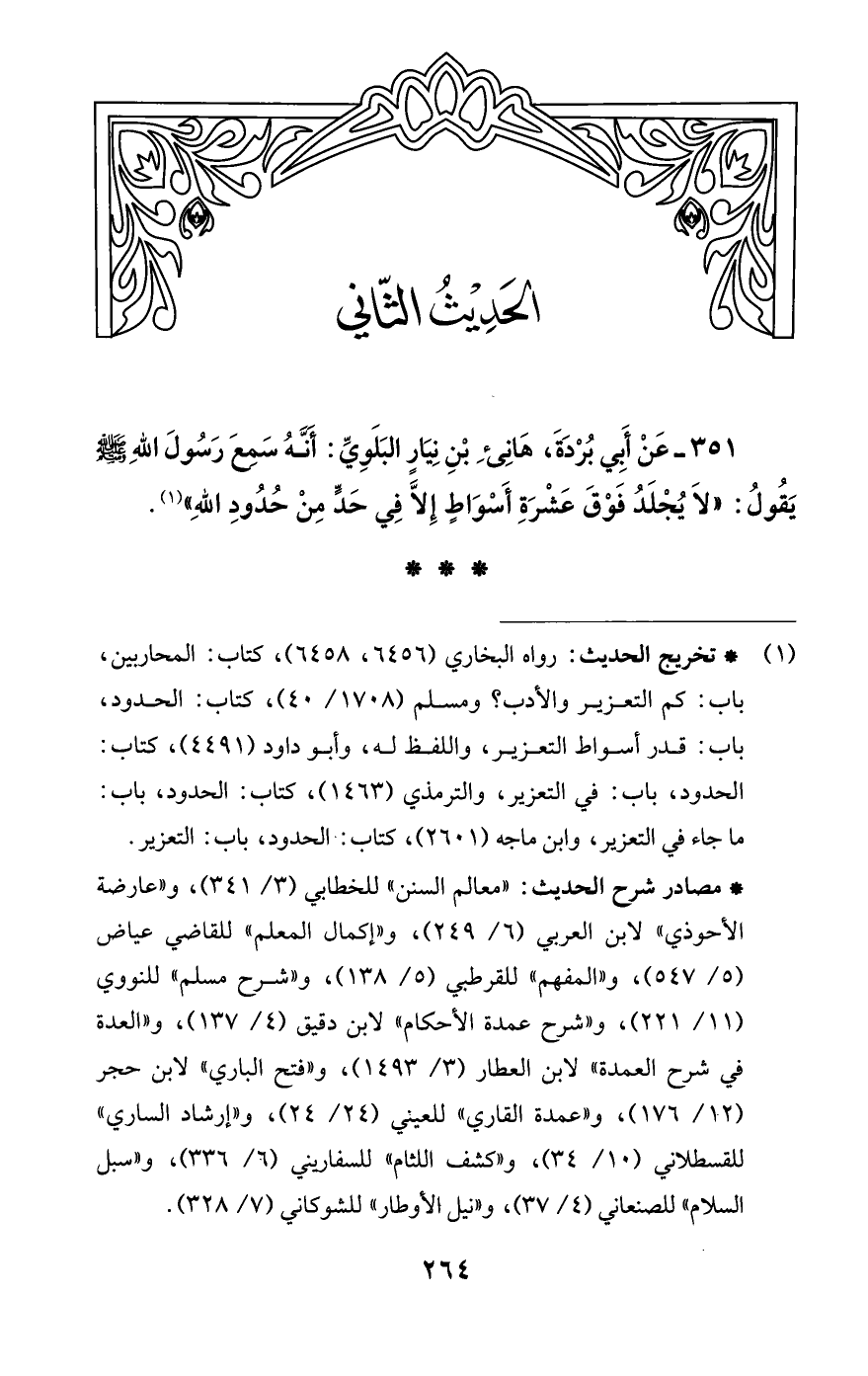 351 - عَنْ أَبي بُرْدَةَ، هَانِىءِ بْنِ نِيَارٍ البَلَوِيِّ: أَنَّهُ سَمعَ رَسُولَ اللَّهِ -صلى اللَّه عليه وسلم- يَقُولُ: "لَا يُجْلَدُ فَوْقَ عَشْرَةِ أَسْوَاطٍ إِلَّا فِي حَدٍّ مِنْ حُدُودِ اللَّهِ" (¬1).