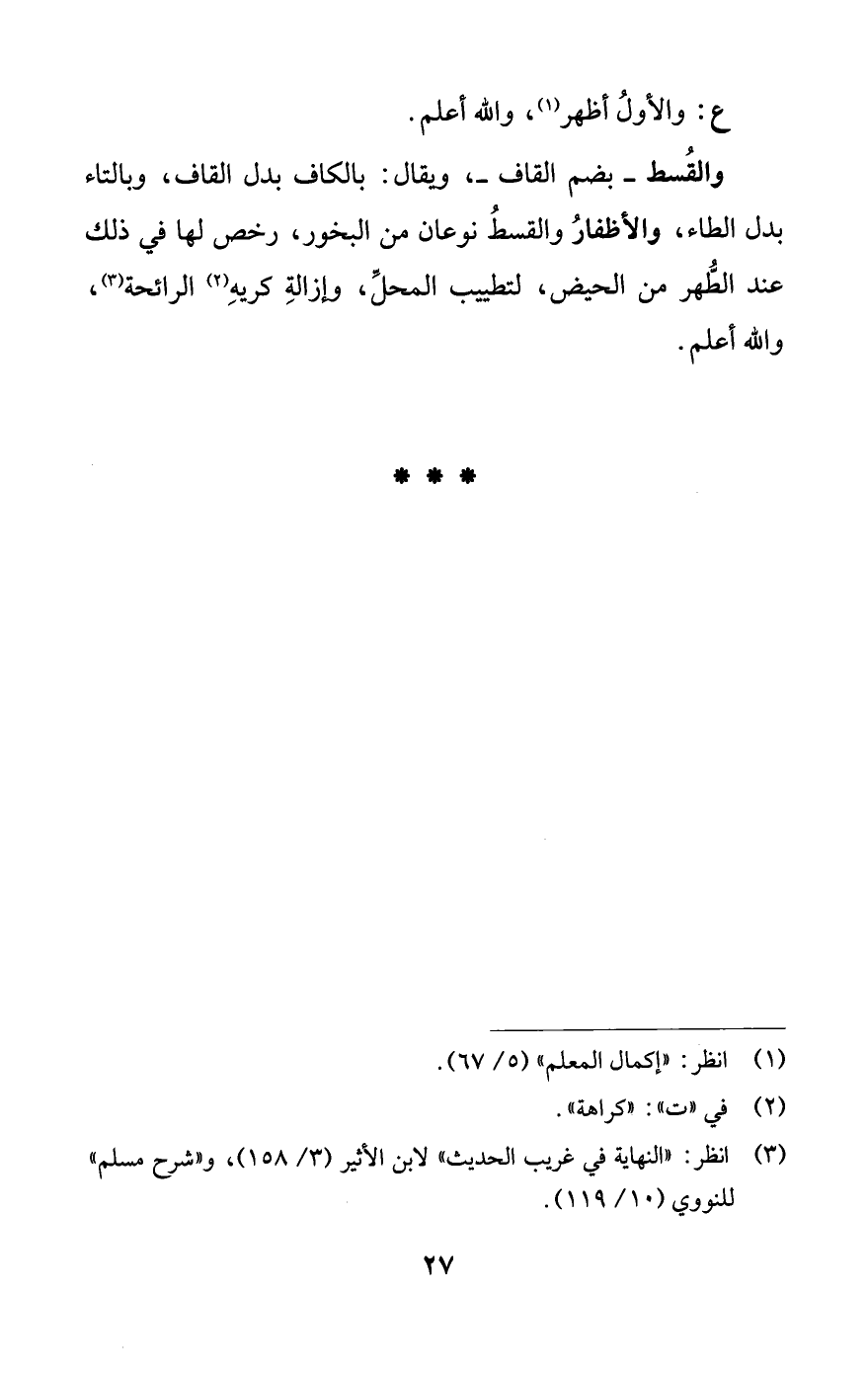 والقُسط -بضم القاف-، ويقال: بالكاف بدل القاف، وبالتاء بدل الطاء، والأظفارُ والقسطُ نوعان من البخور، رخص لها في ذلك عند الطُّهر من الحيض، لتطييب المحلِّ، وإزالةِ كريهِ (¬2) الرائحة (¬3)، واللَّه أعلم.